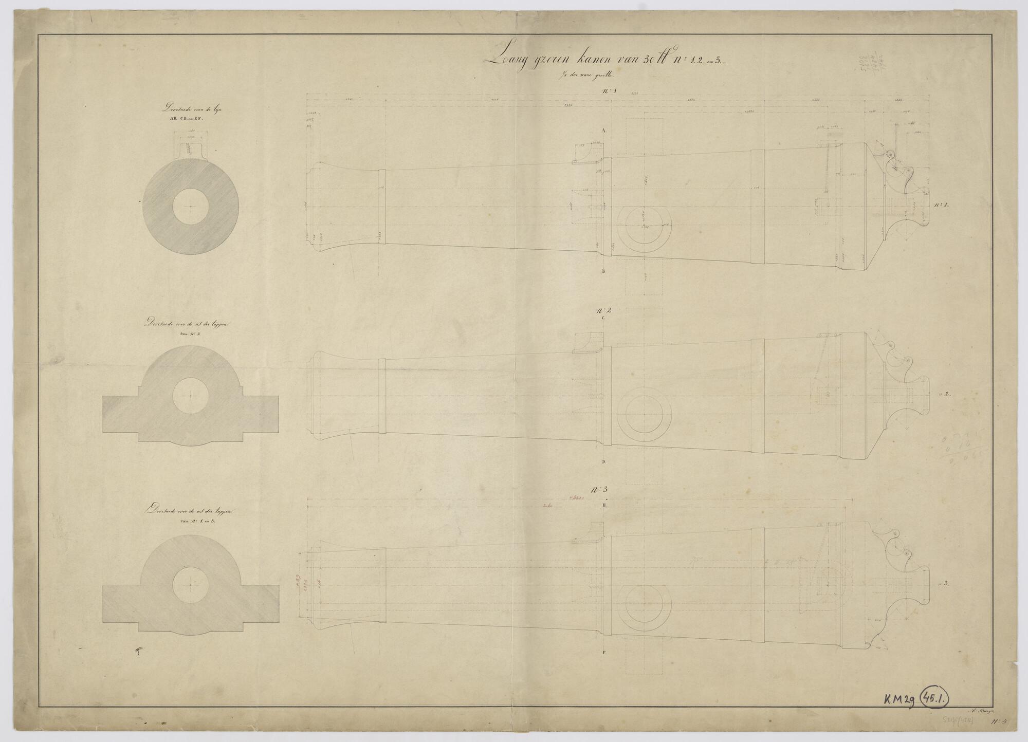 Verticale langsdoorsneden en dwarsdoorsneden van het lang ijzeren kanon van 30 lb no 1, 2, en 3 (schaal 1:2).