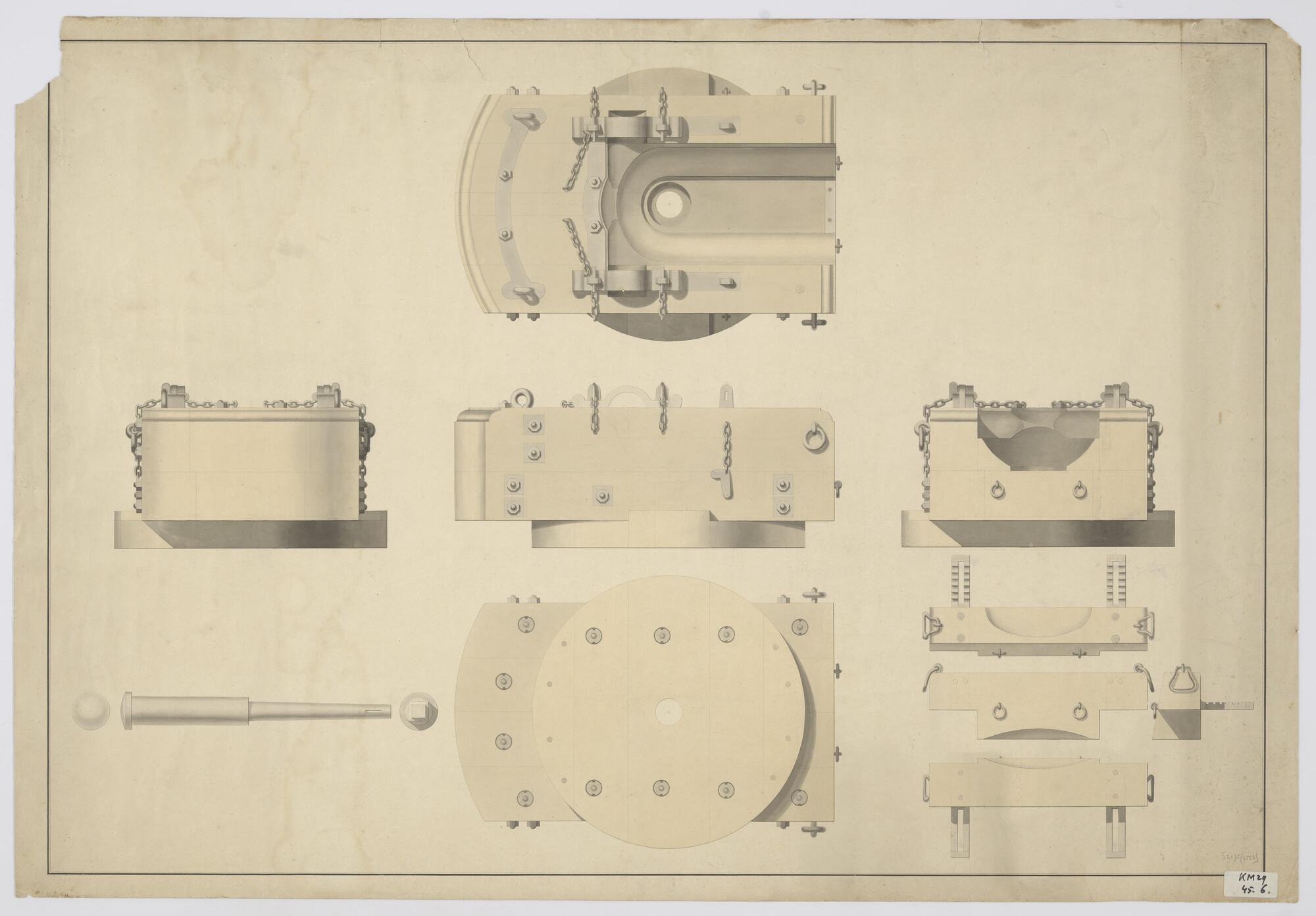 Diverse doorsneden van onderdelen van een kanon (schaal 1:1).