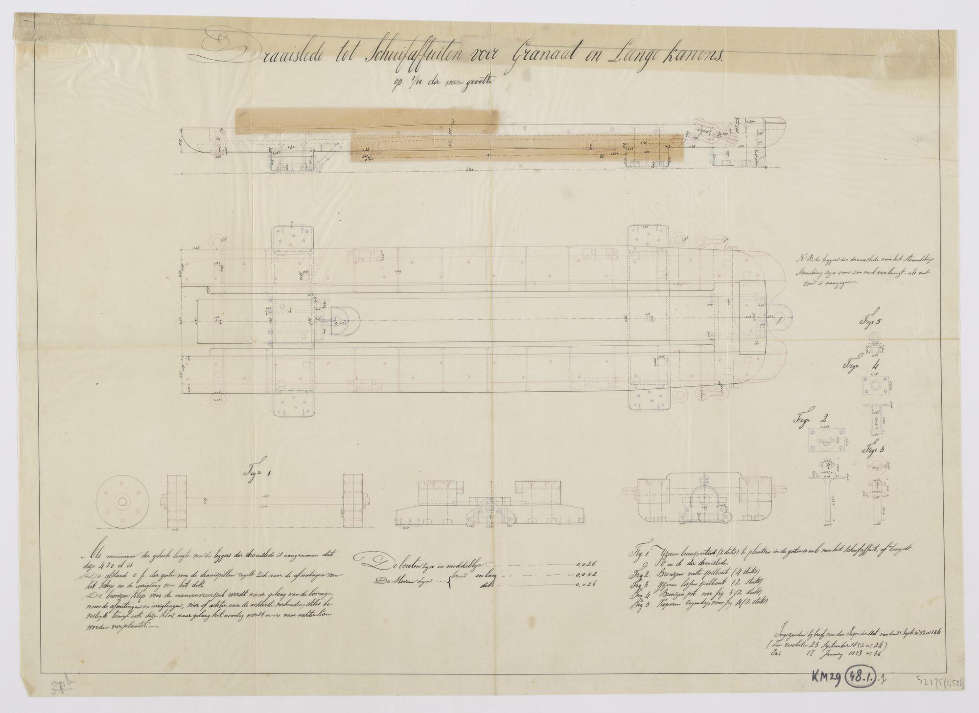 Diverse doorsneden van een draaislede tot schuifaffuiten voor granaat- en lange kanons (schaal 1:10).
