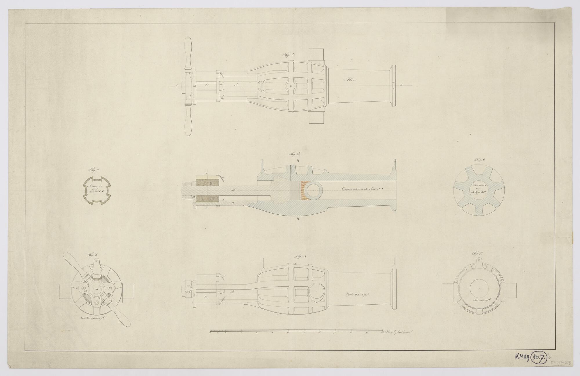 Verticale en horizontale langsdoorsnede; vóór-zij- en achteraanzicht en dwarsdoorsneden van een kanon Achterlaad met door ribben versterkte kamer en bolvormig sluitstuk met vier nokken in de asrichting (schaal in Nederlandse palmen).