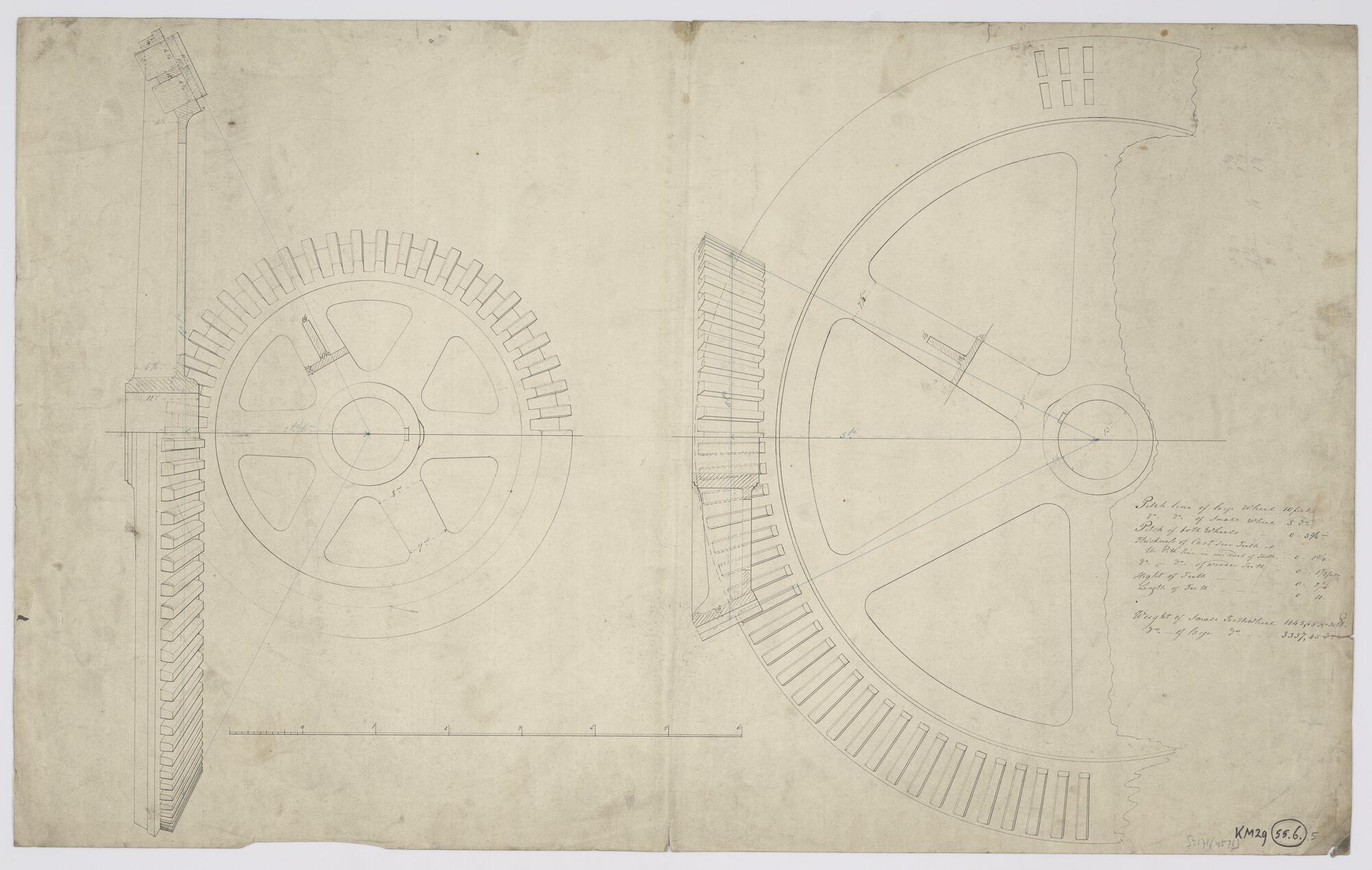 Diverse doorsneden en aanzichten van tandwielen voor trek- en boorbanken.