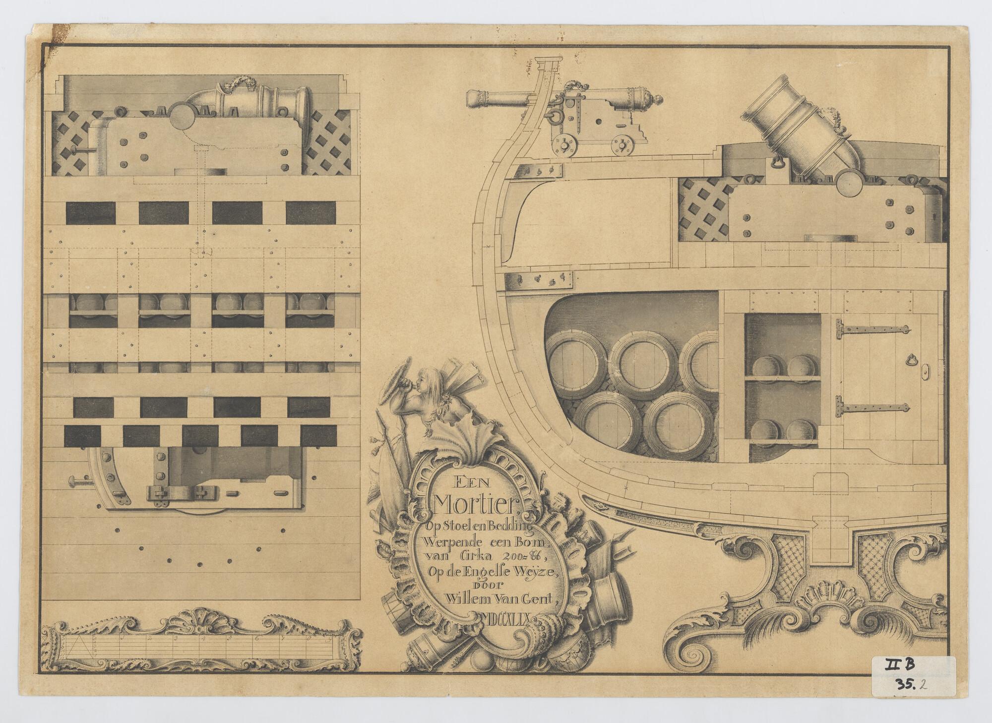 Opstelling, op Engelse wijze, van mortieren en opslag munitie aan boord van een bombardeerschip.