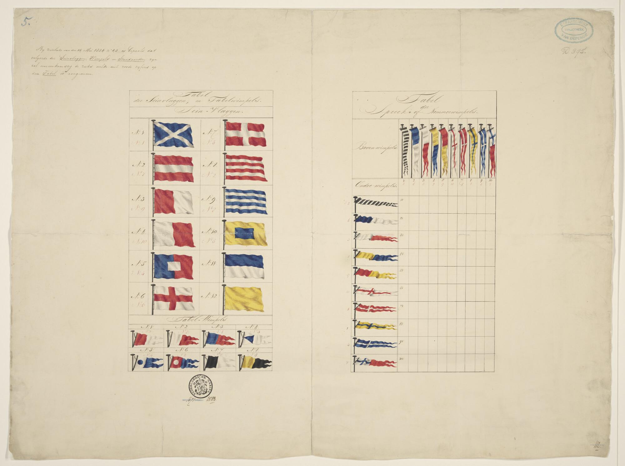 Vlaggenkaart met 40 afbeeldingen van seinvlaggen, 1834.