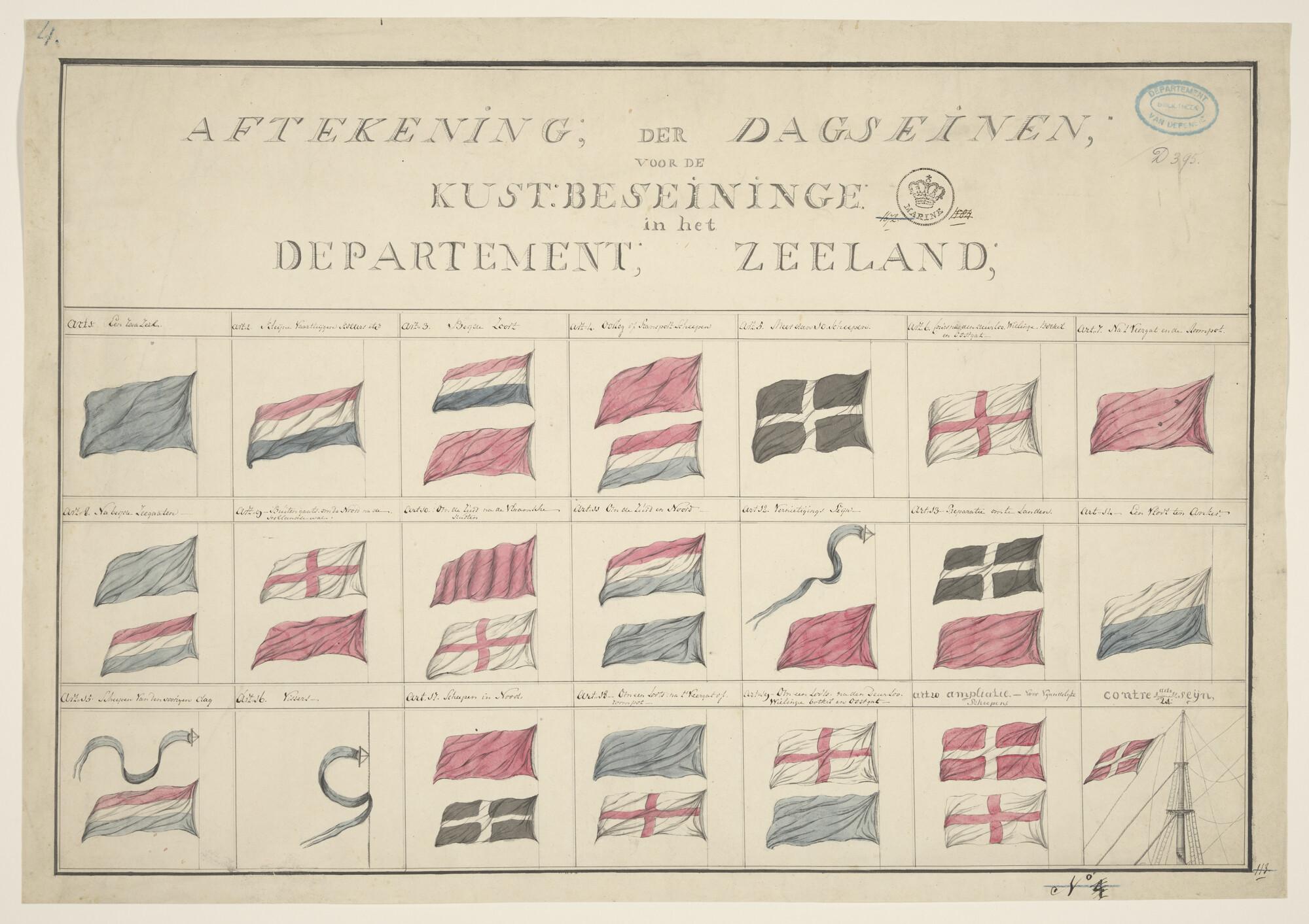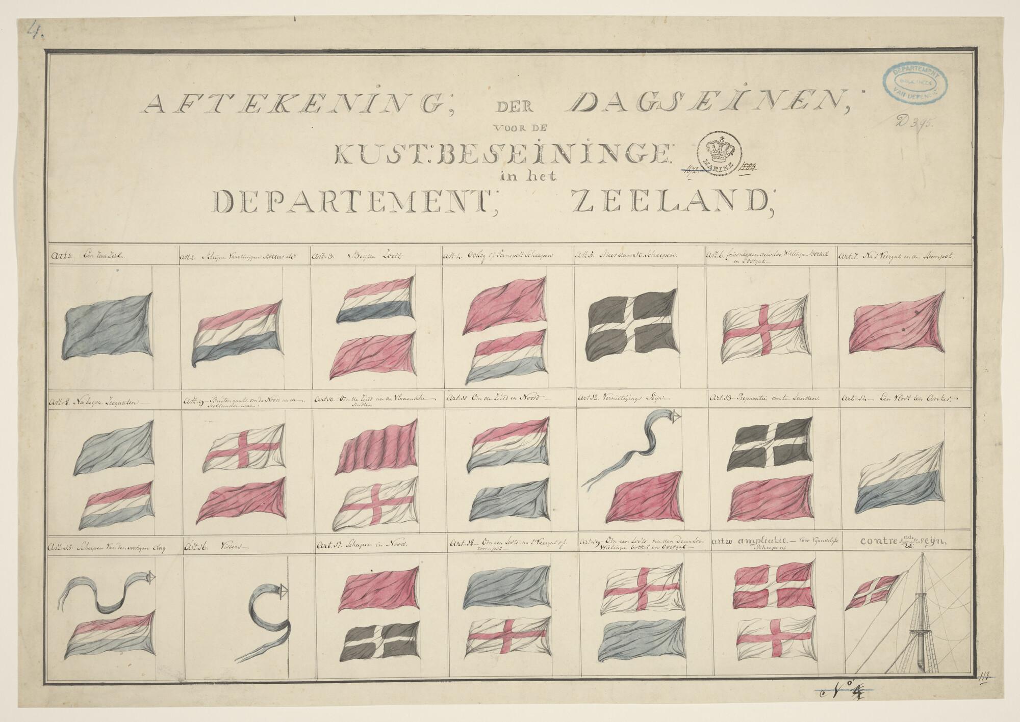 Vlaggenkaart, dagseinen Zeeland, 21 afbeeldingen van seinvlaggen