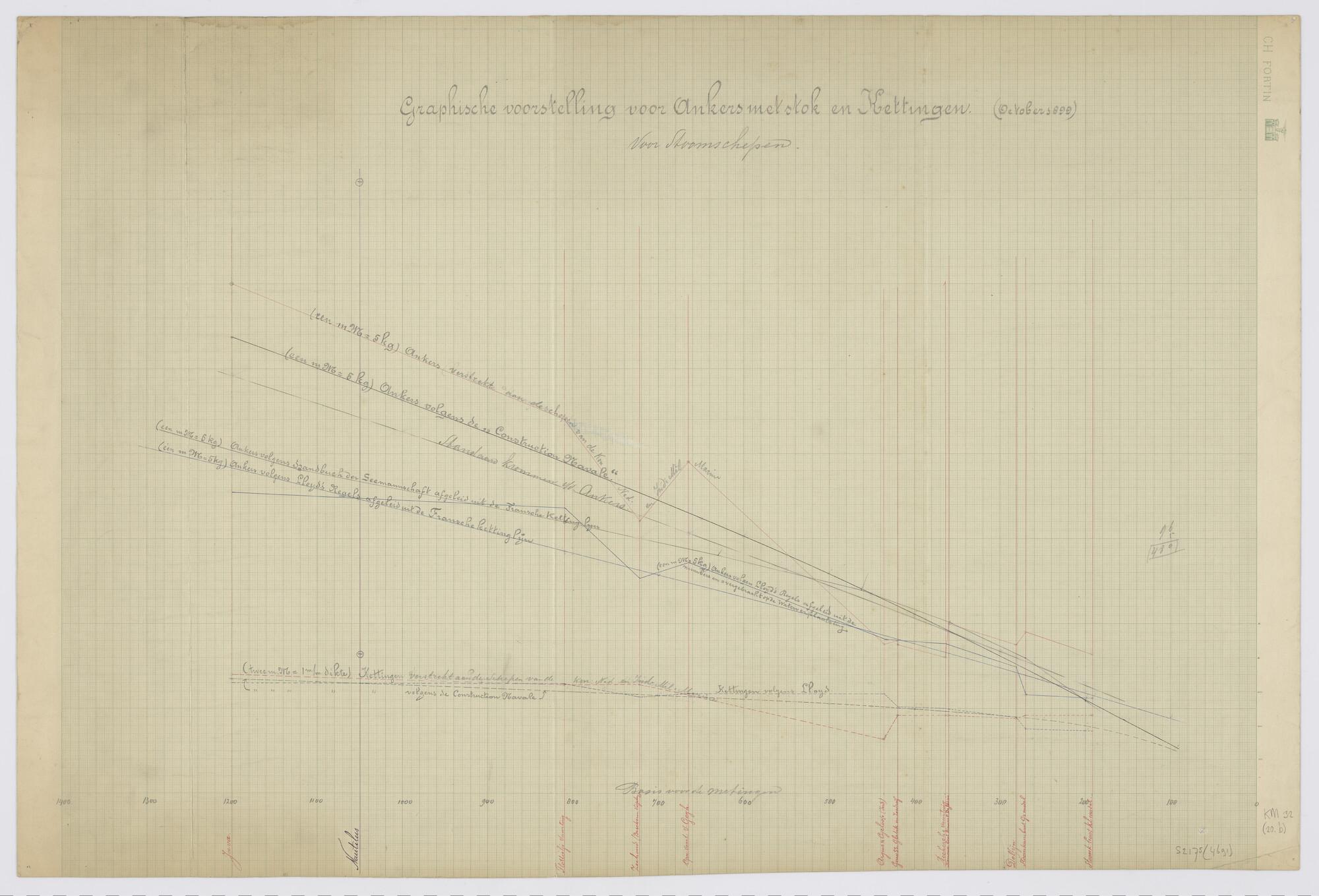 Grafische voorstelling van gewichten der ankers en kettingen voor stoomschepen van de Koninklijke marine en de Indische Militaire marine alsmede voor buitenlandse schepen.