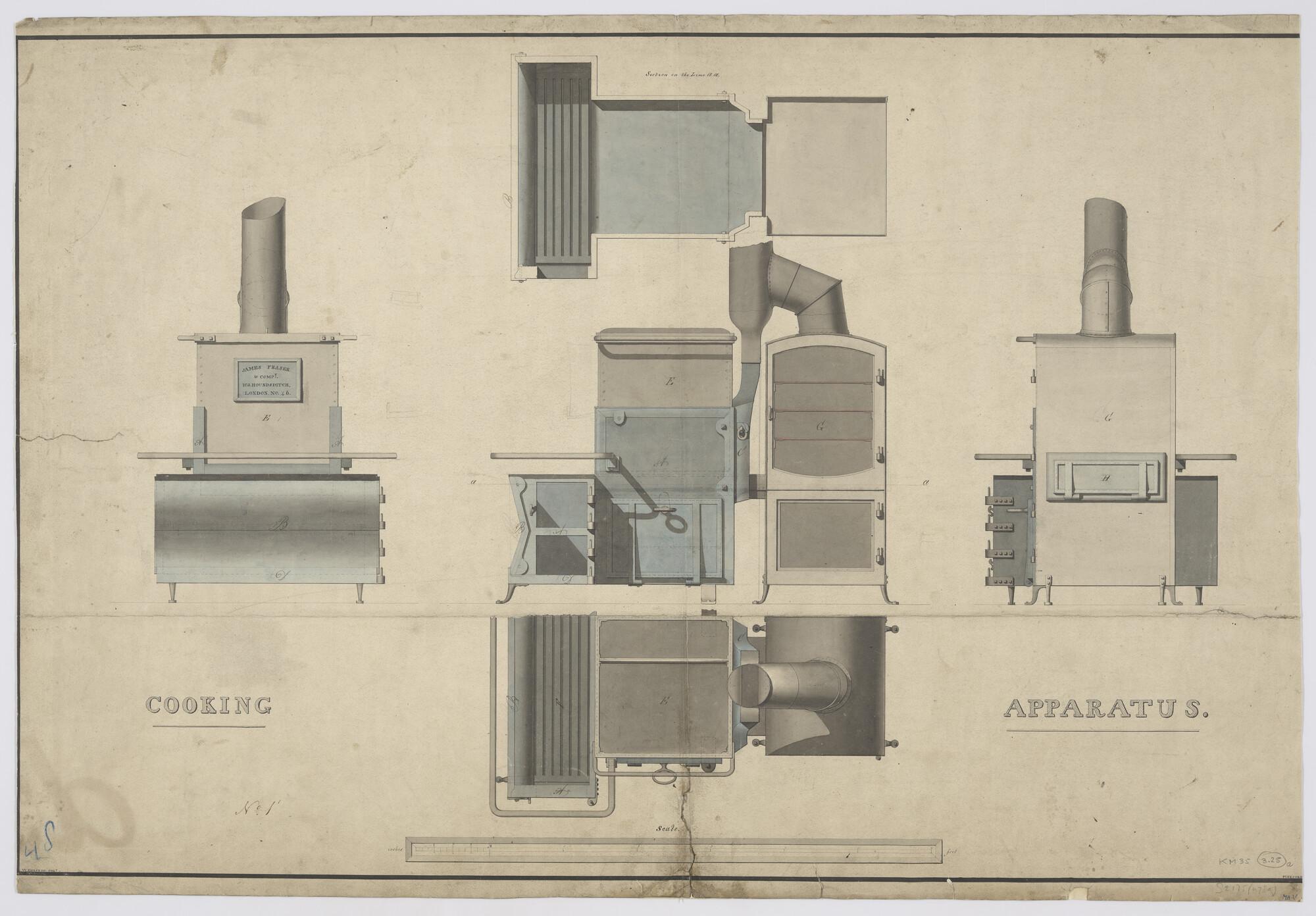 Diverse aanzichten en doorsneden van een kombuisinstallatie (fornuis en oven). Kookplaat, oven, vuurhaard, schoorsteen.