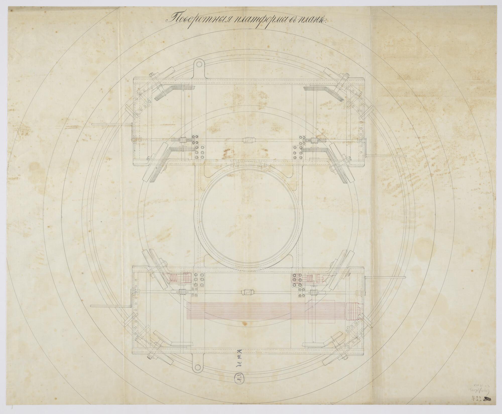 Horizontale dwarsdoorsnede van de baksinrichting van de geschutskoepel van een schip uit de klasse van het gepantserde kustverdedigingsschip van de Russische keizerlijke marine 'Vice-admiraal Popow'