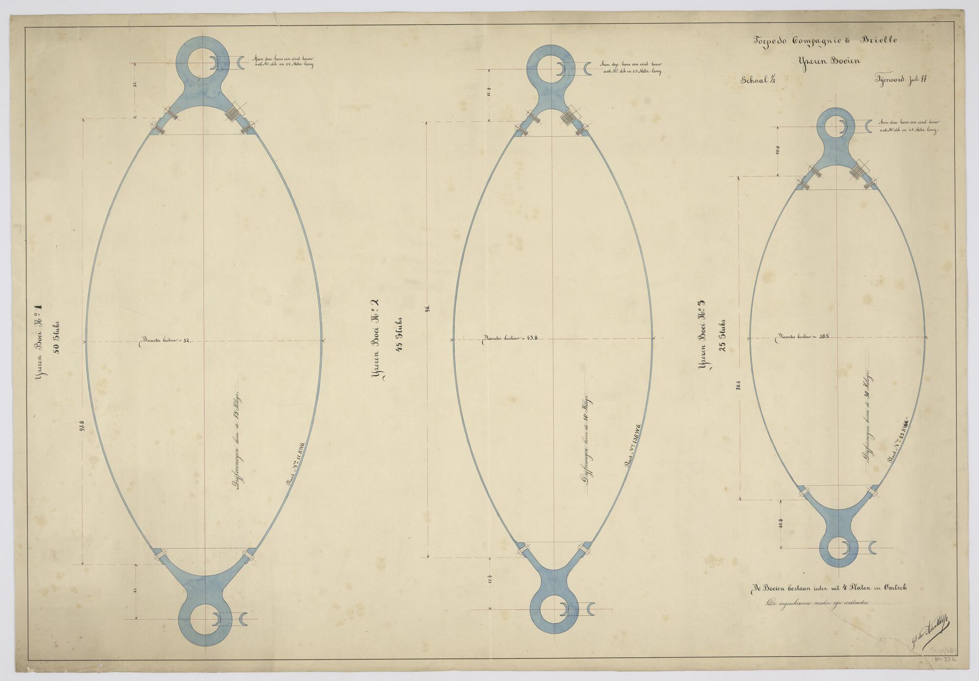 Doorsneden van ijzeren boeien no 1; no 2 en no 3 (schaal 1:2).