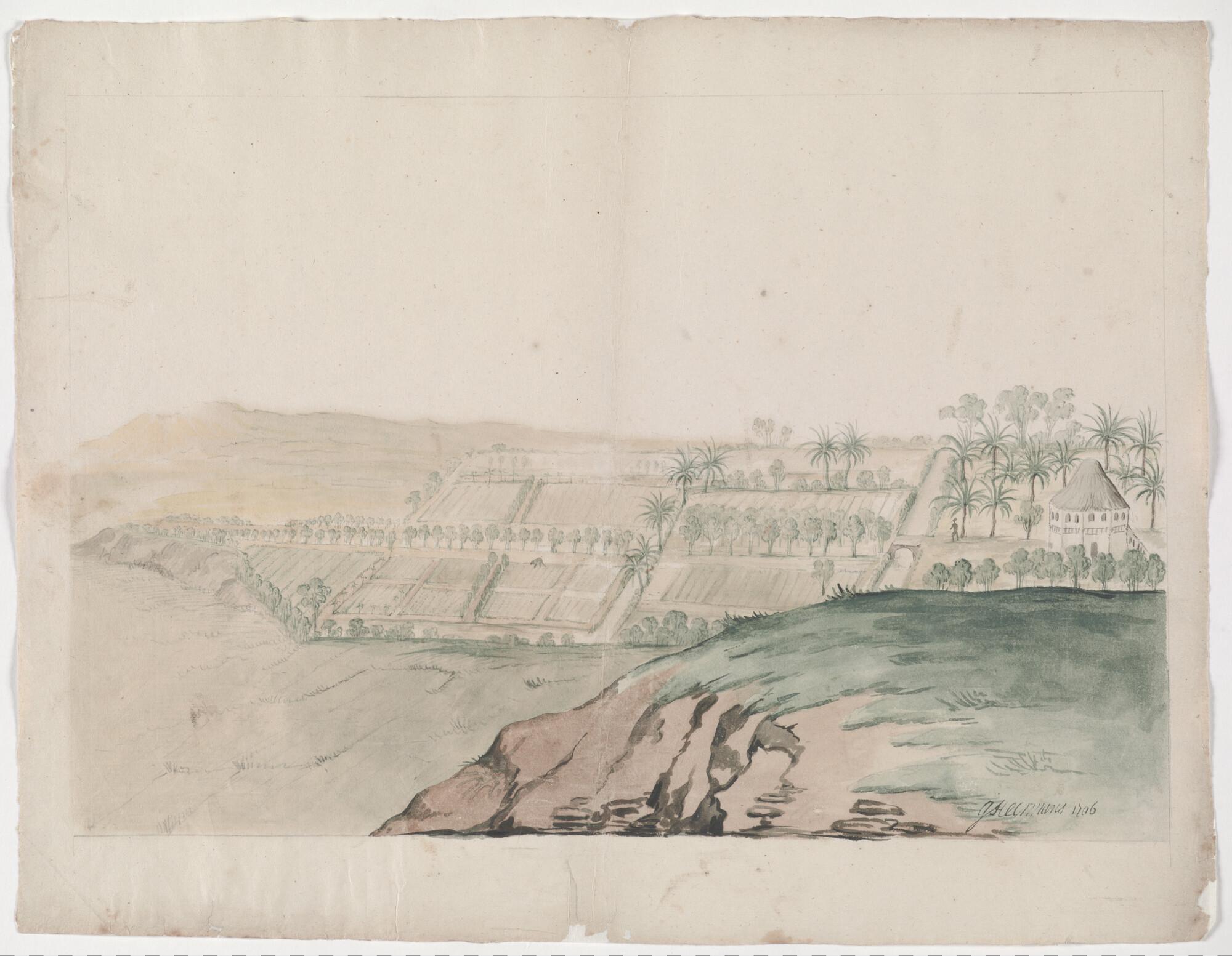 Plantage aan de kust van West-Afrika, gezien vanaf een hoog punt; mogelijk betreft het de tuinen en een der voorposten van de heuvel St. Jago en Fort Coenraadsburg, bij Elmina