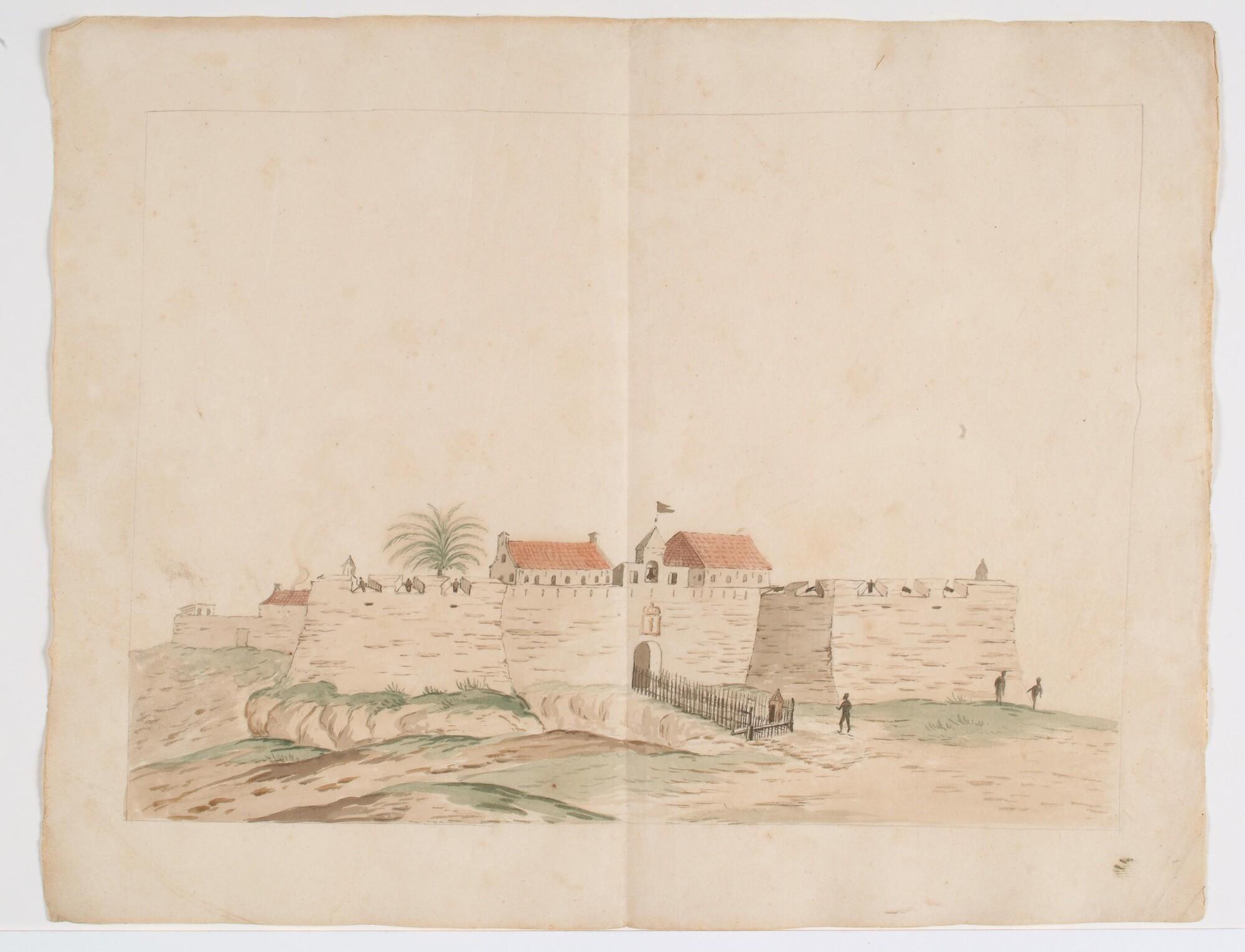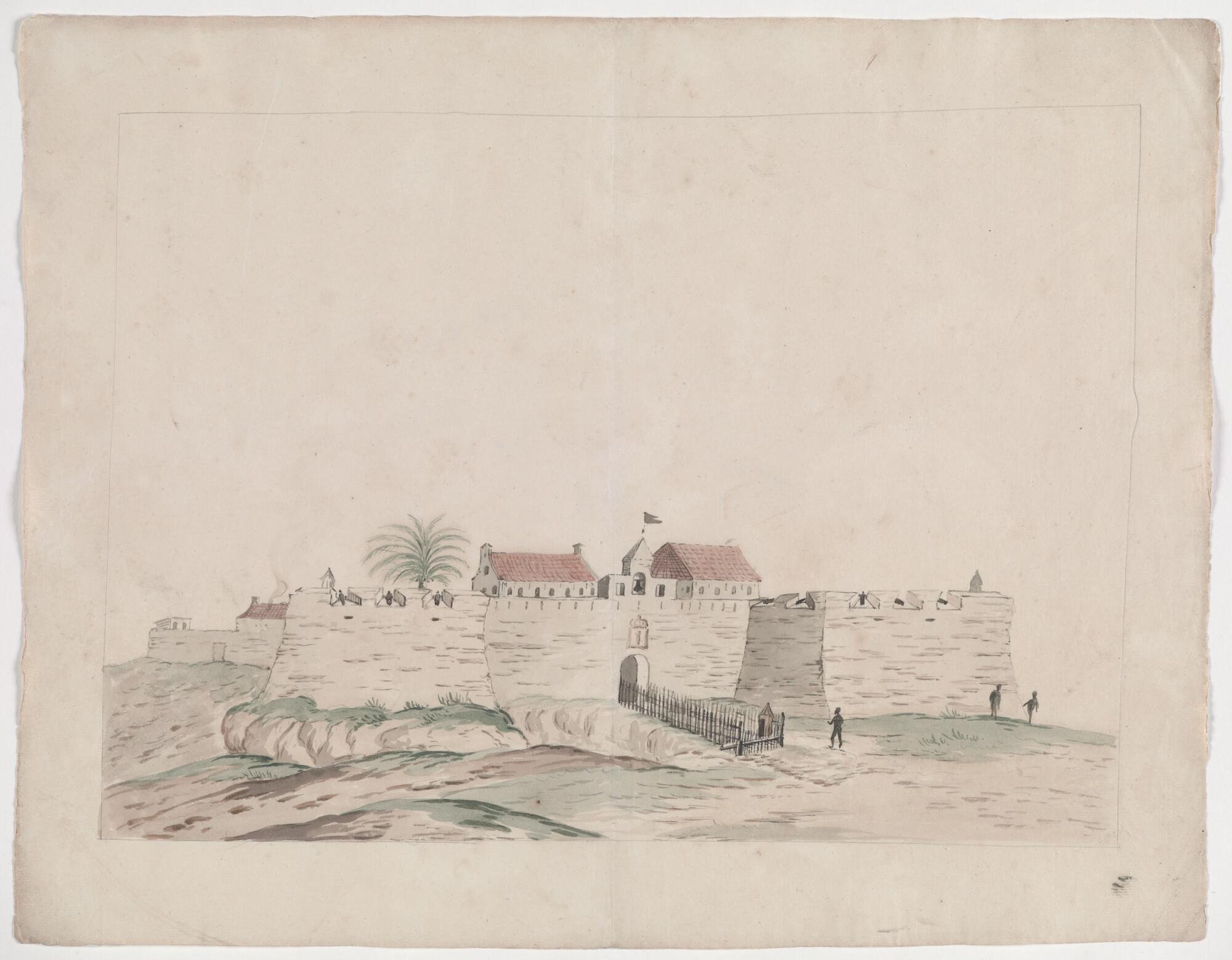 Het Brandenburgese fort Groot Frederiksburg aan de kust van West-Afrika, voorzijde. Voorstudie voor illustratie in boek van Willem Bosman.