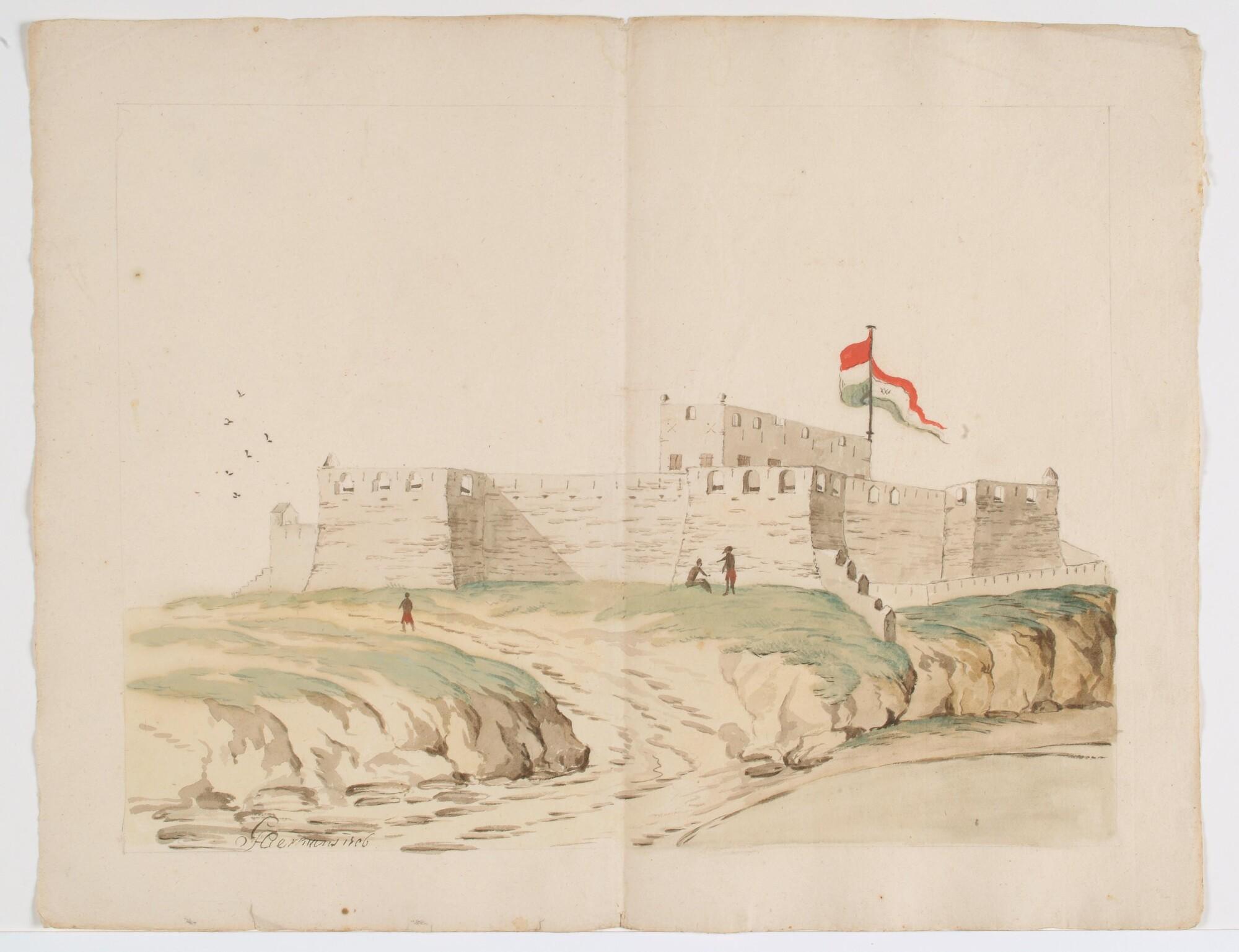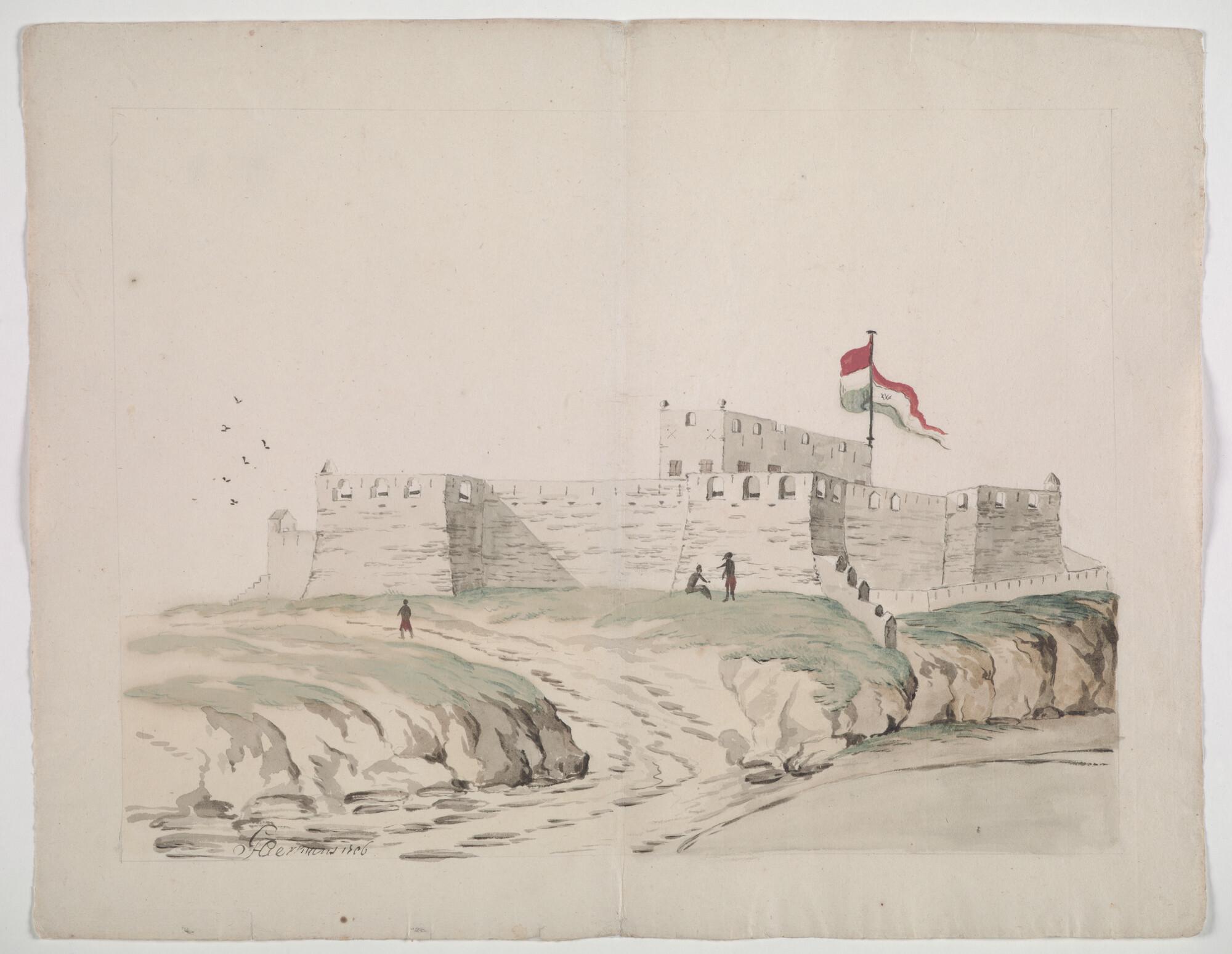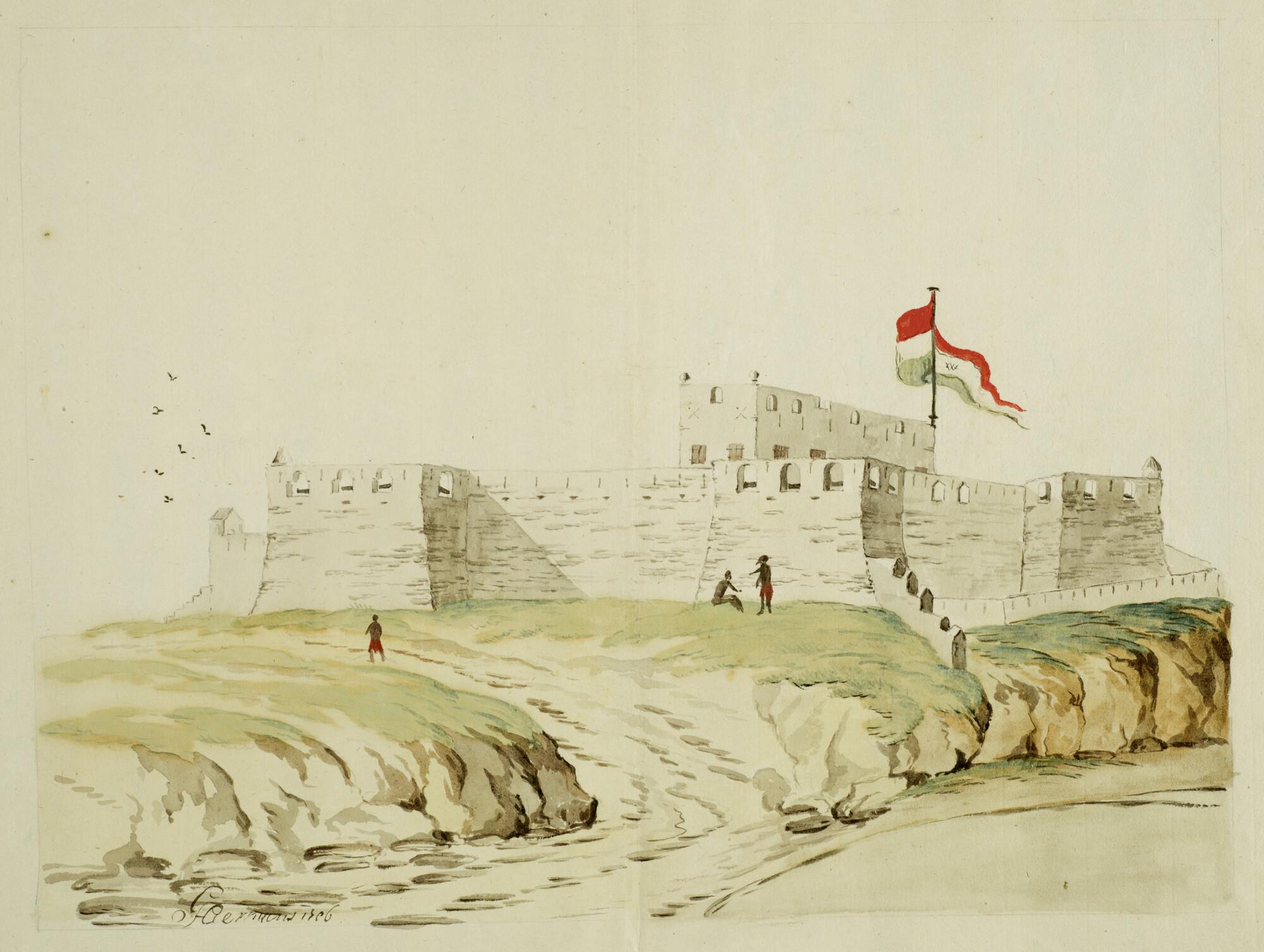 Nederlands fort Crevecoeur aan de kust van West-Afrika, met Nederlandse vlag met WIC-monogram; op de voorgrond drie Afrikanen.