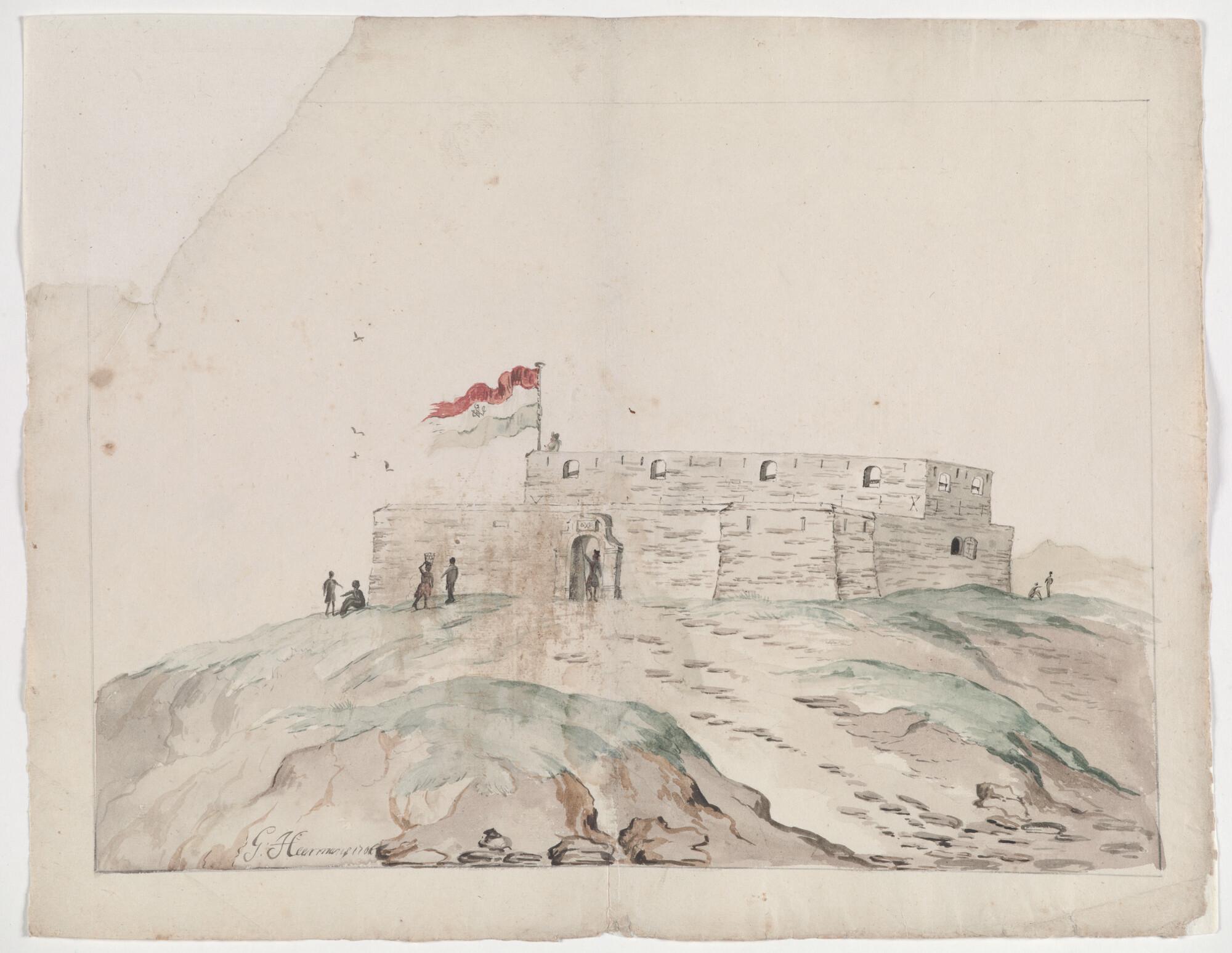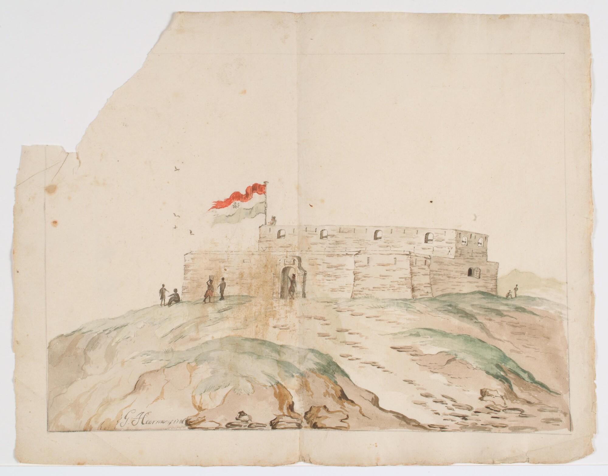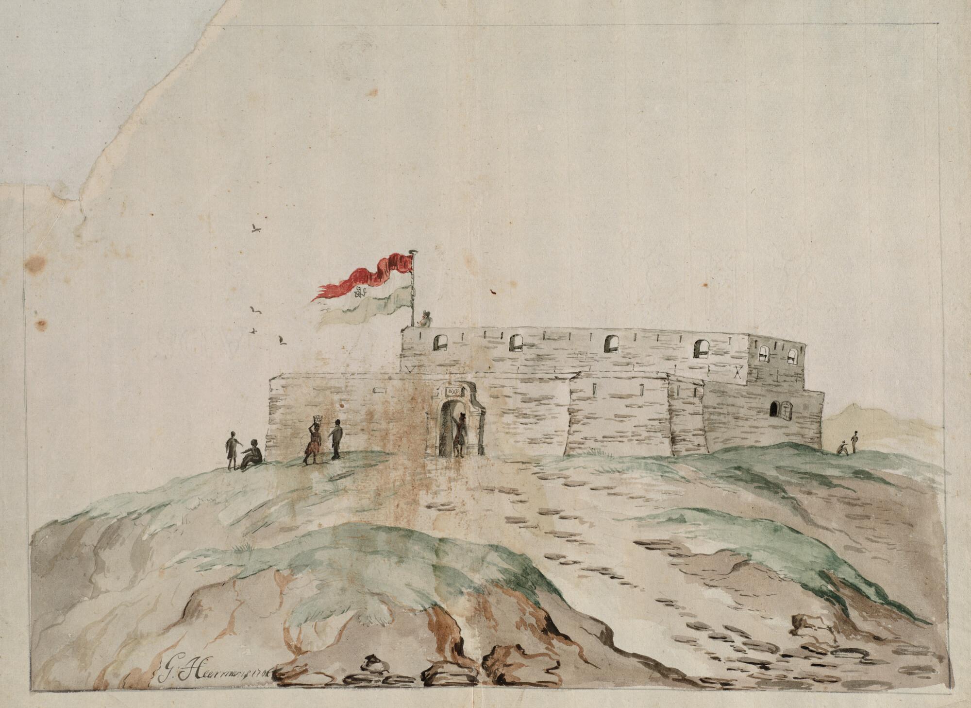 Het Nederlandse fort Oranje te Sacondé aan de kust van West-Afrika; in de Nederlandse vlag en boven de poort het WIC-monogram, voor de poort een soldaat met speer; links vier Afrikanen. Voorstudie voor illustratie in boek van Willem Bosman.