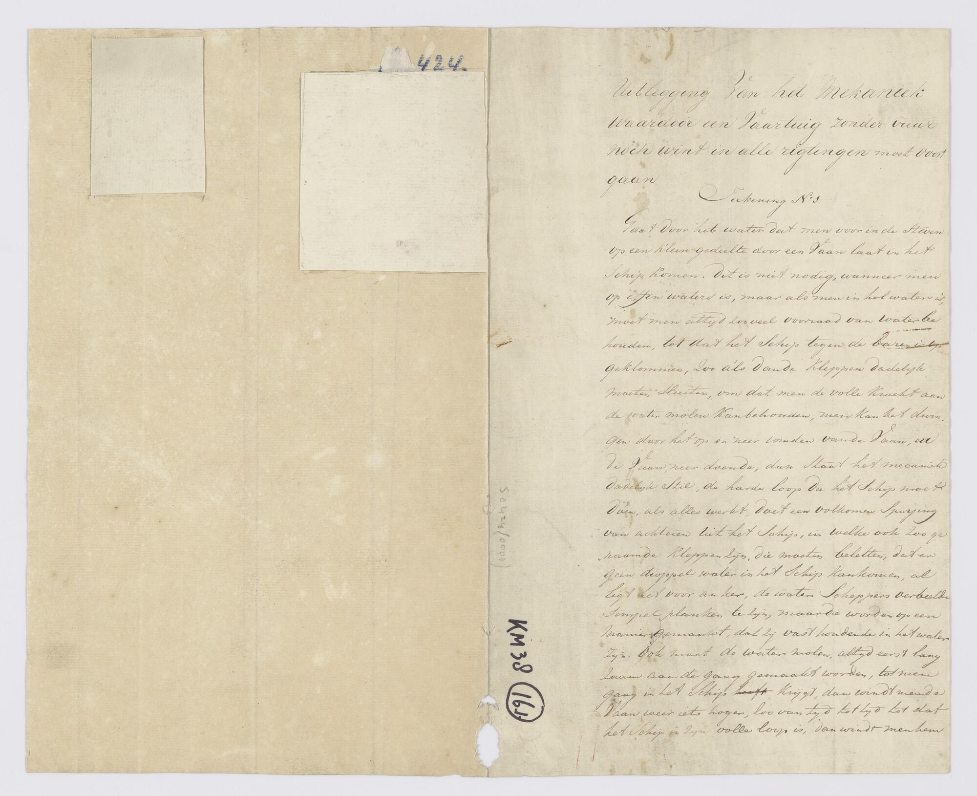 Handgeschreven technische beschrijving van de drie tekeningen over een mechaniek waardoor een vaartuig zonder vuur noch wind in alle richtingen moet voortgaan. Uitvinding van Abraham Wolferts, Bergen, Henegouwen, België (schaal 1:1).