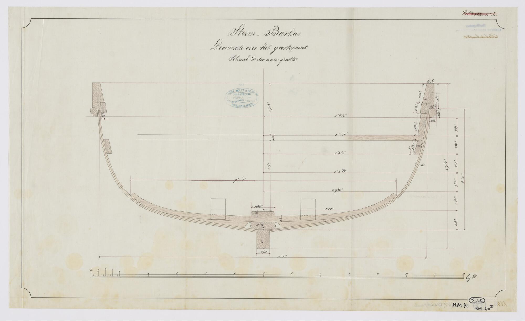 Dwarsdoorsnede over het grootspant van een stoombarkas [1879], lang 12.90 meter (schaal 1:8).