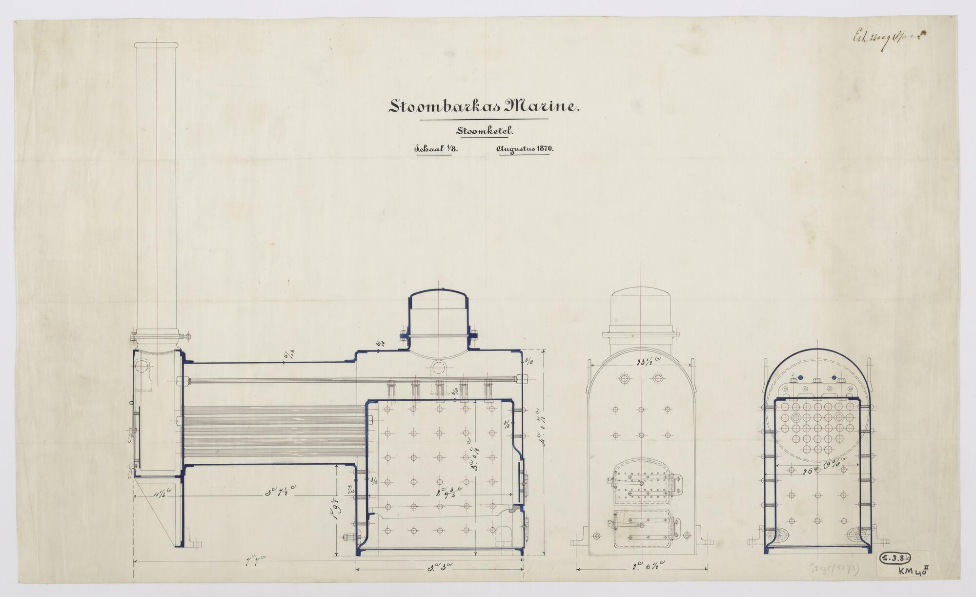 Langsdoorsnede, dwarsdoorsneden van een stoomketel, locomotiefmodel, aan boord van de stoombarkas (1870) (schaal 1:8).