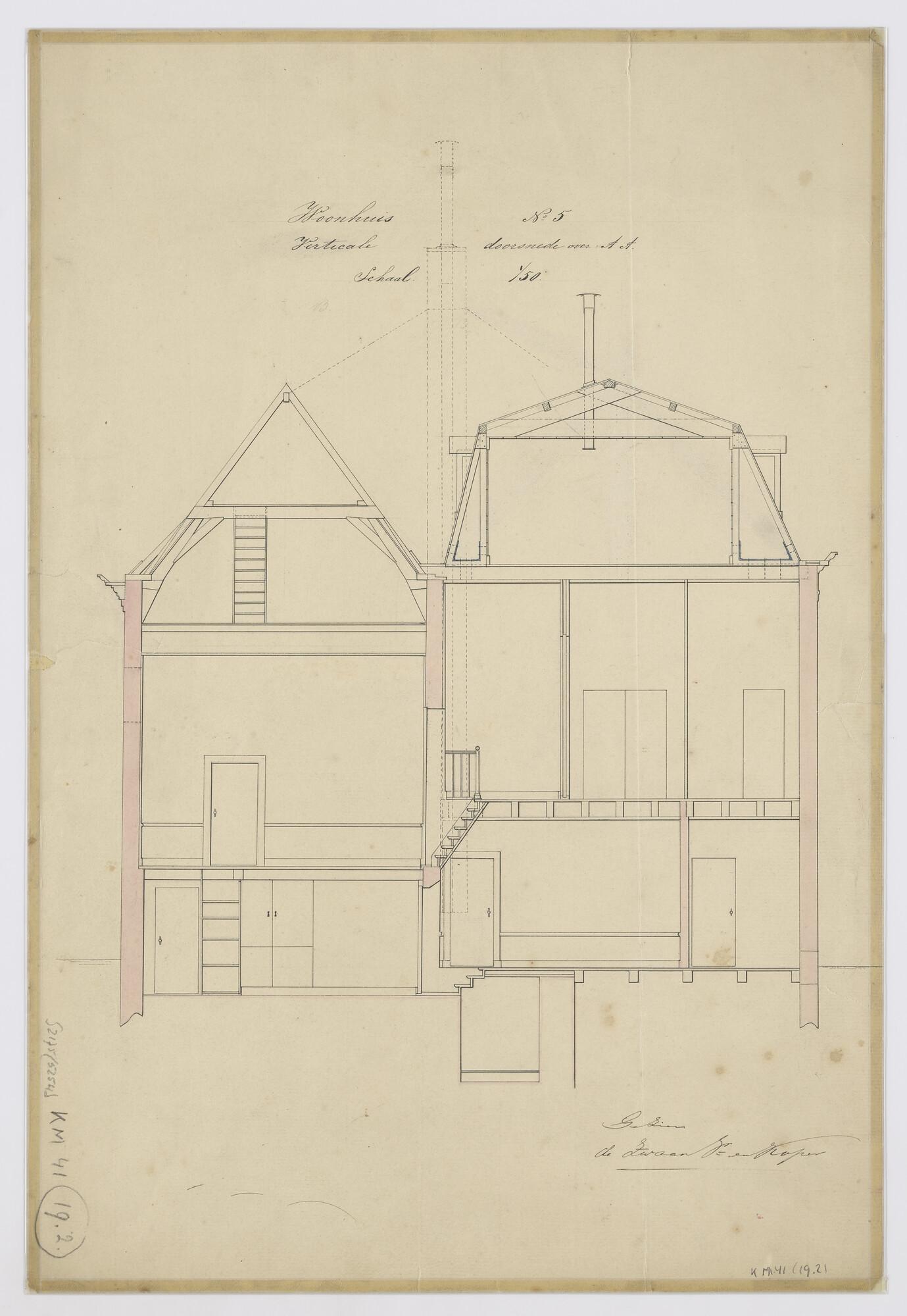 Verticale doorsnede van woonhuis nr. 5 (o.m. de uitbouw) van de Voorwerf van de Rijkswerf te Amsterdam omstreeks 1870 (schaal 1:50).