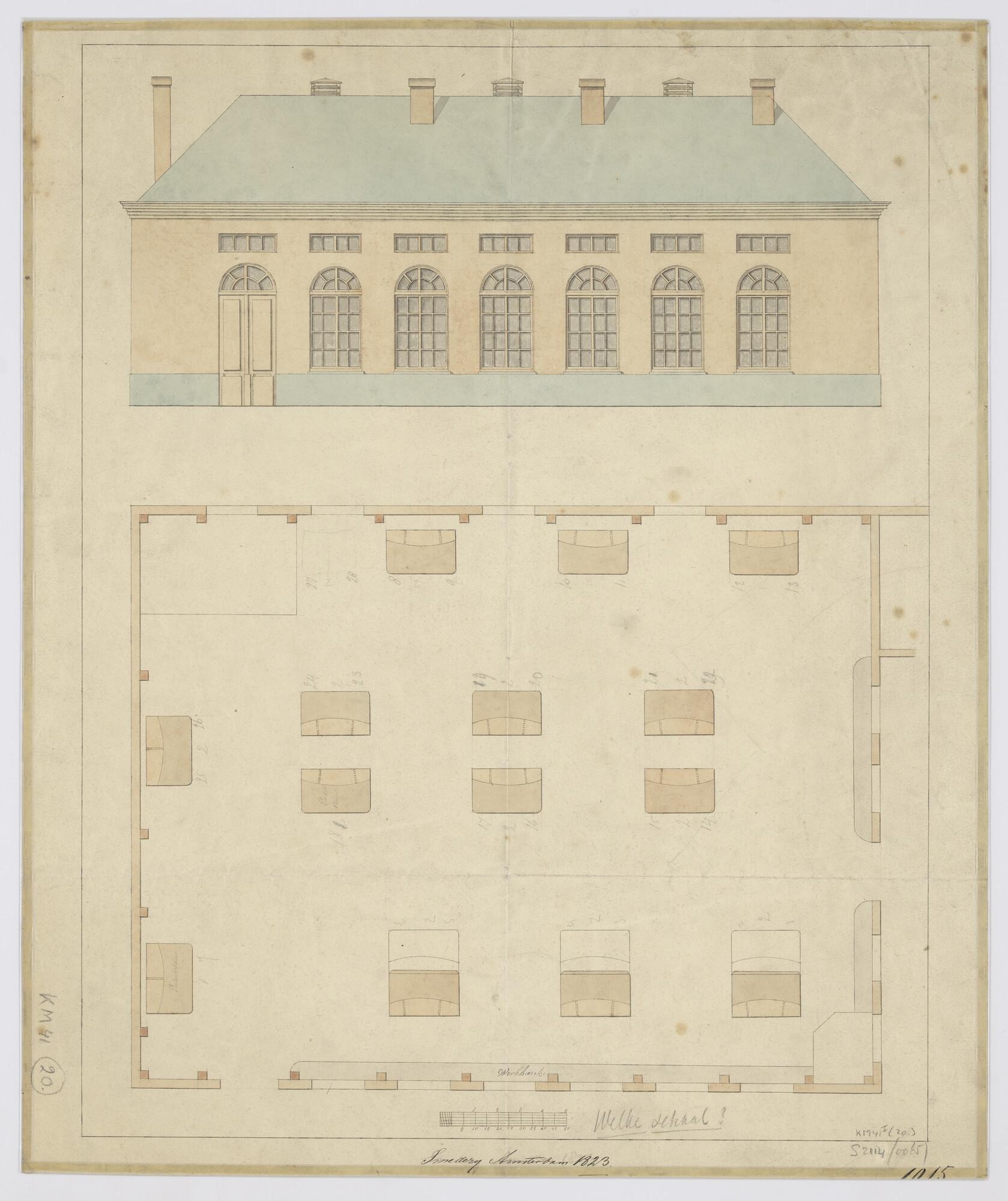 Vooraanzicht en indelingstekening van de oude smederij op de Rijkswerf te Amsterdam in 1823