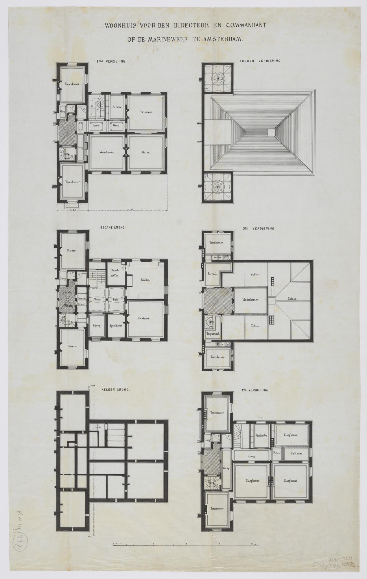 Indelingstekening van het woonhuis voor de directeur en commandant in het "Paleis" op de marinewerf te Amsterdam evenwijdig aan de IJ-gracht en tegenover de Prins Hendrikkade (omstr.1880). Kelder; begane grond; 1ste verdieping; 2de verdieping; 3de verdieping; zolder verdieping (schaal 1:100).