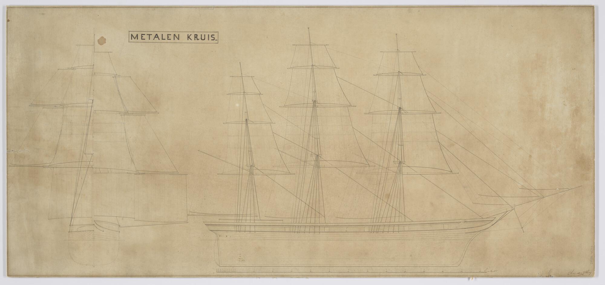 Zij-, voor- en achteraanzicht van de tuigage van de clipper 'Metalen Kruis'.