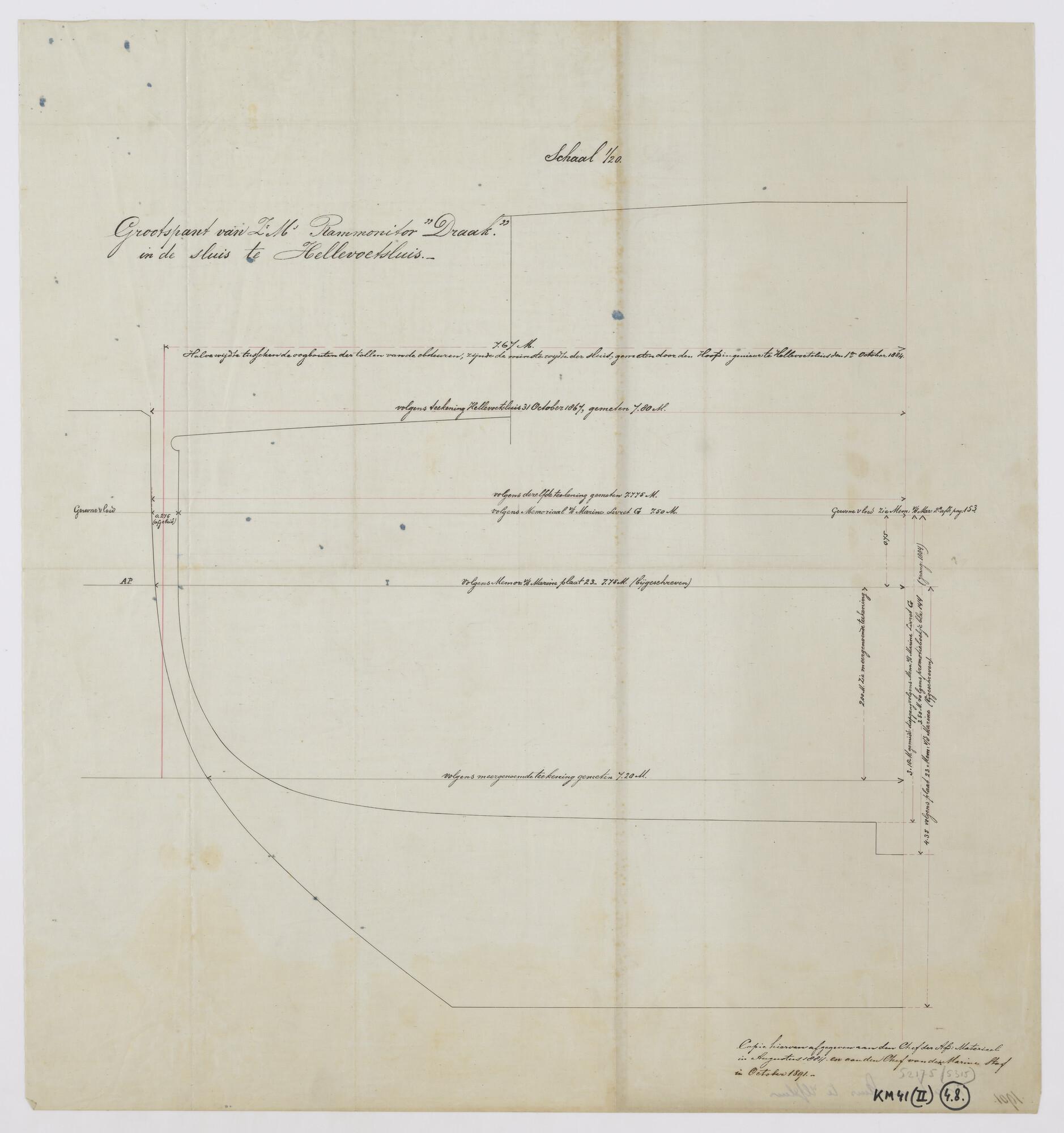 Dwarsdoorsnede van het grootspant van de rammonitor Zr.Ms. 'Draak' in de Marine Zeedoksluis te Hellevoetsluis bij gewone vloed (schaal 1:20).