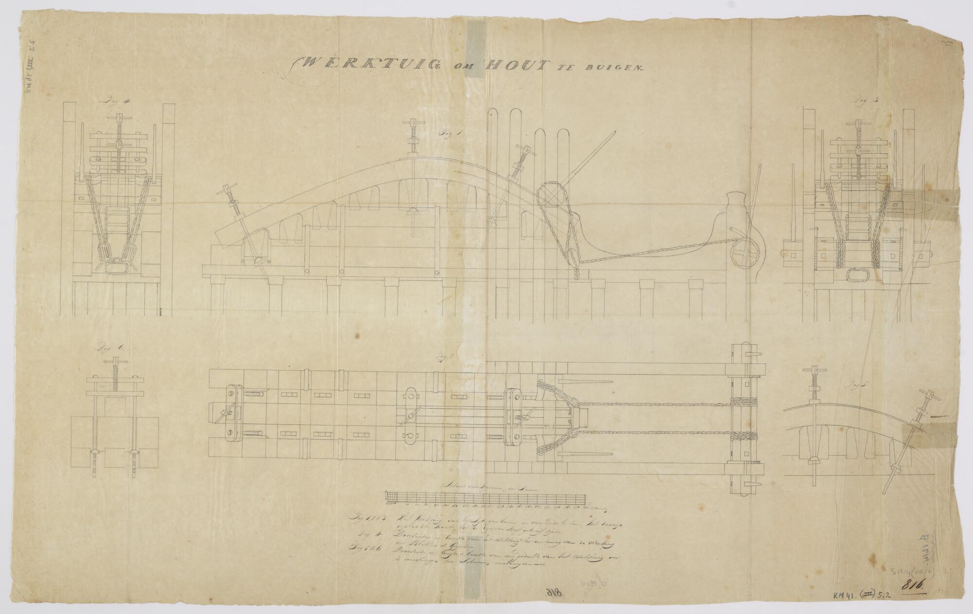 Doorsneden (zes figuren) van een werktuig om hout te buigen (schaal 2 palmen op de duim).