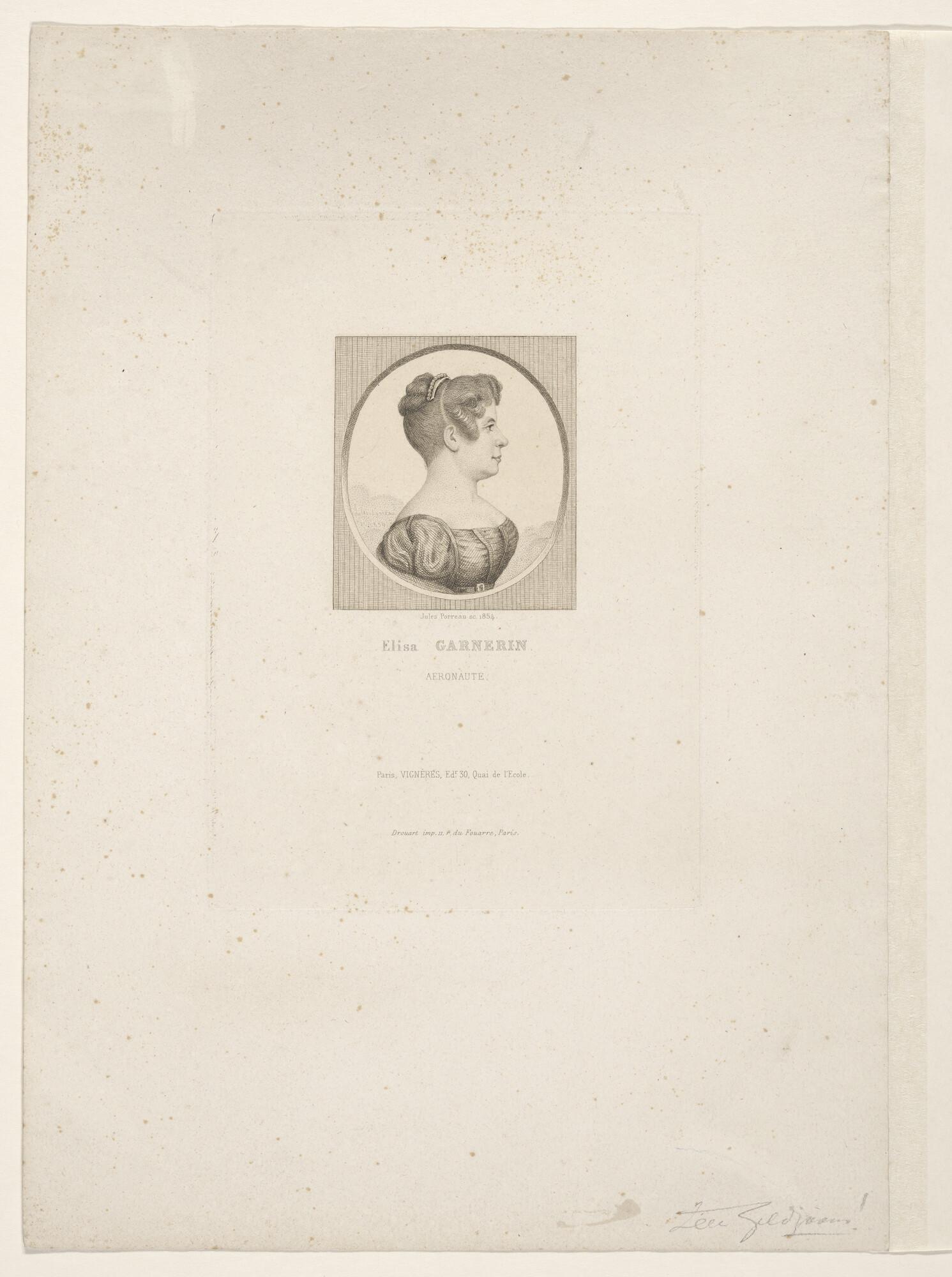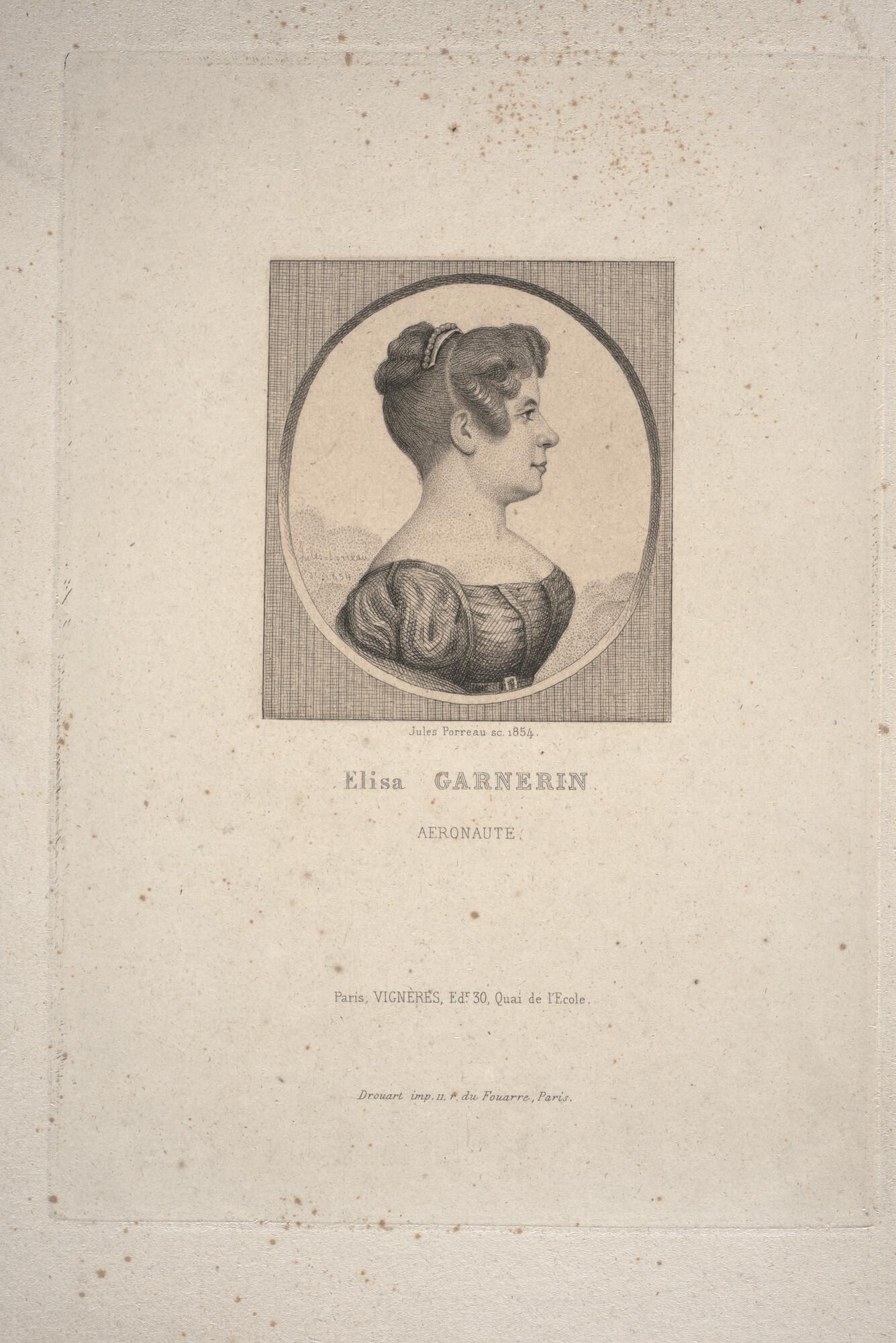 Portret van Élisa Garnerin, aeronaute. Elisa Garnerin maakte haar eerste ballonvluchten op 15-jarige leeftijd, en maakte 39 parachutesprongen tussen 1815 en 1836 in Italië, Spanje, Rusland, Duitsland en Frankrijk.