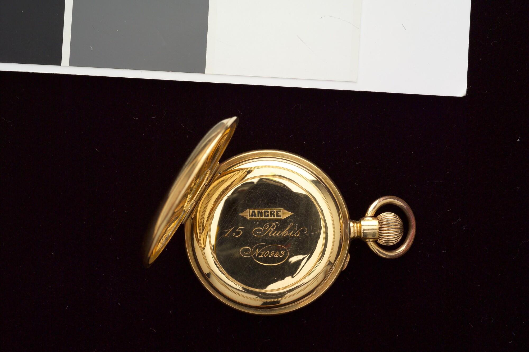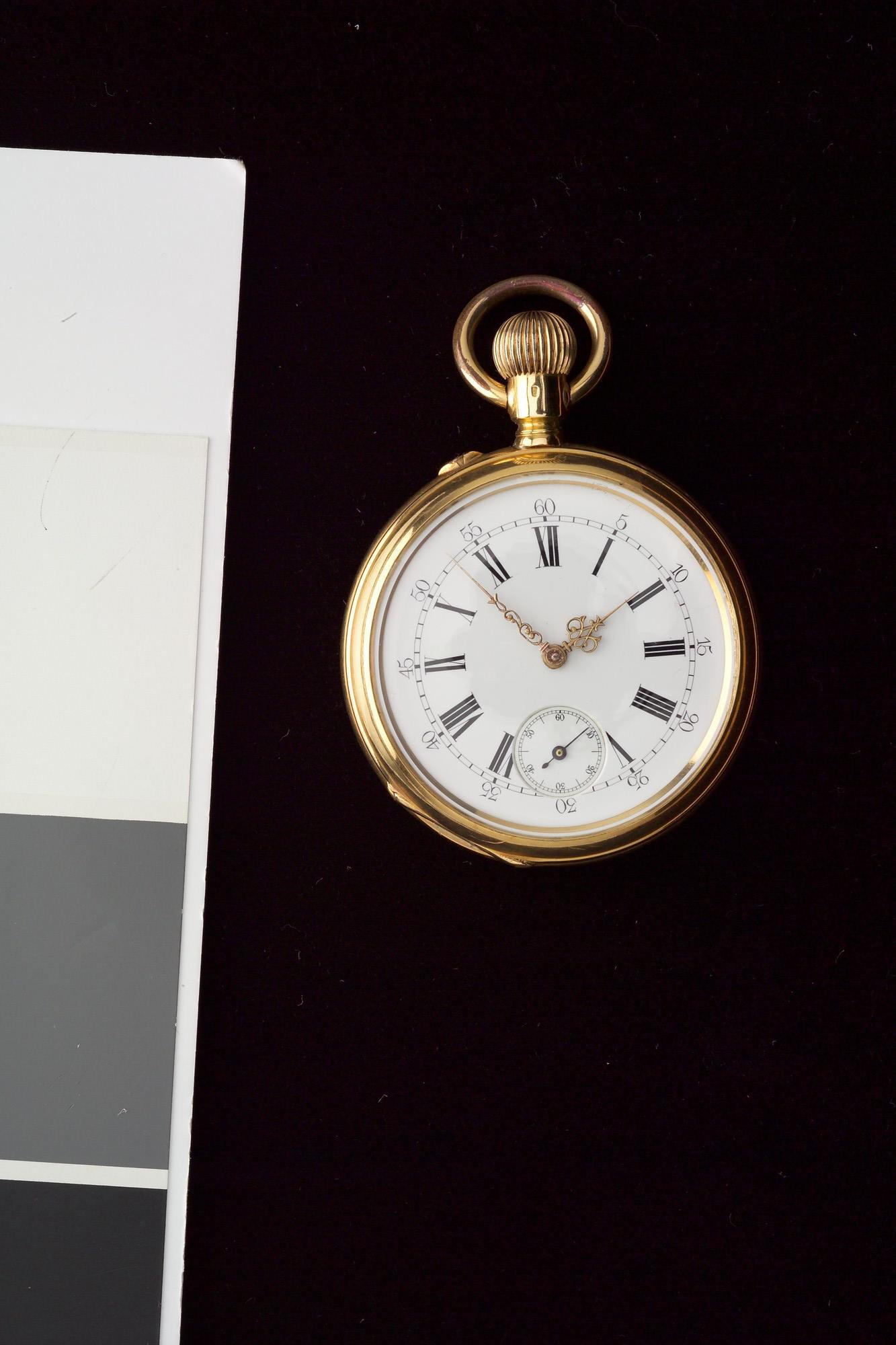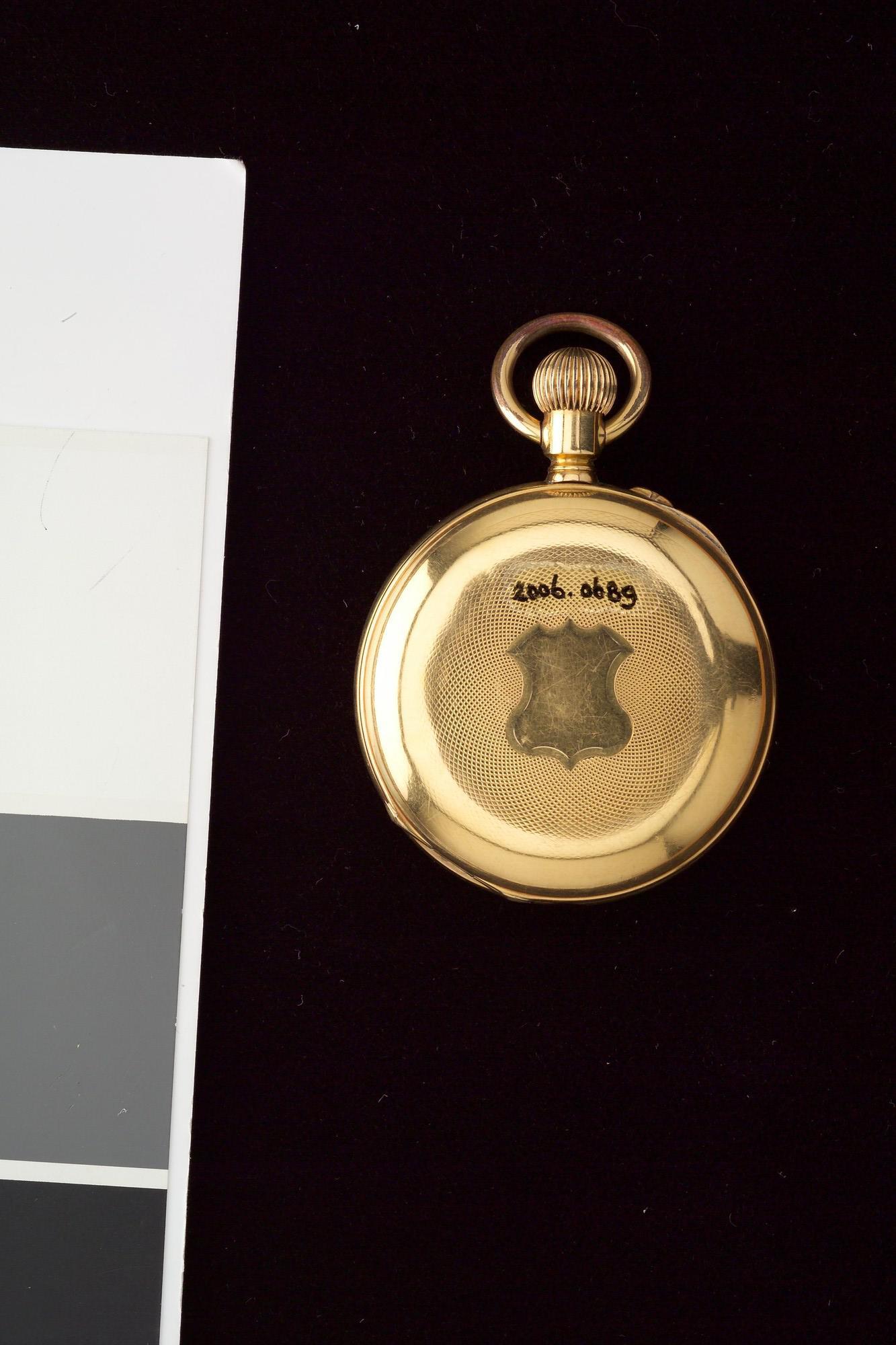 Gouden zakhorloge van Zwitsers of Franse makelij, bij K.B. van 1 juli 1888 aangeboden aan Kapitein John McAuley van het ss. Tenier door de Nederlandse gezant in Brussel, baron Dericke van Herwijnen, vanwege de redding van de 11-koppige bemanning van de Nederlandse bark Mathilda, met inscriptie.