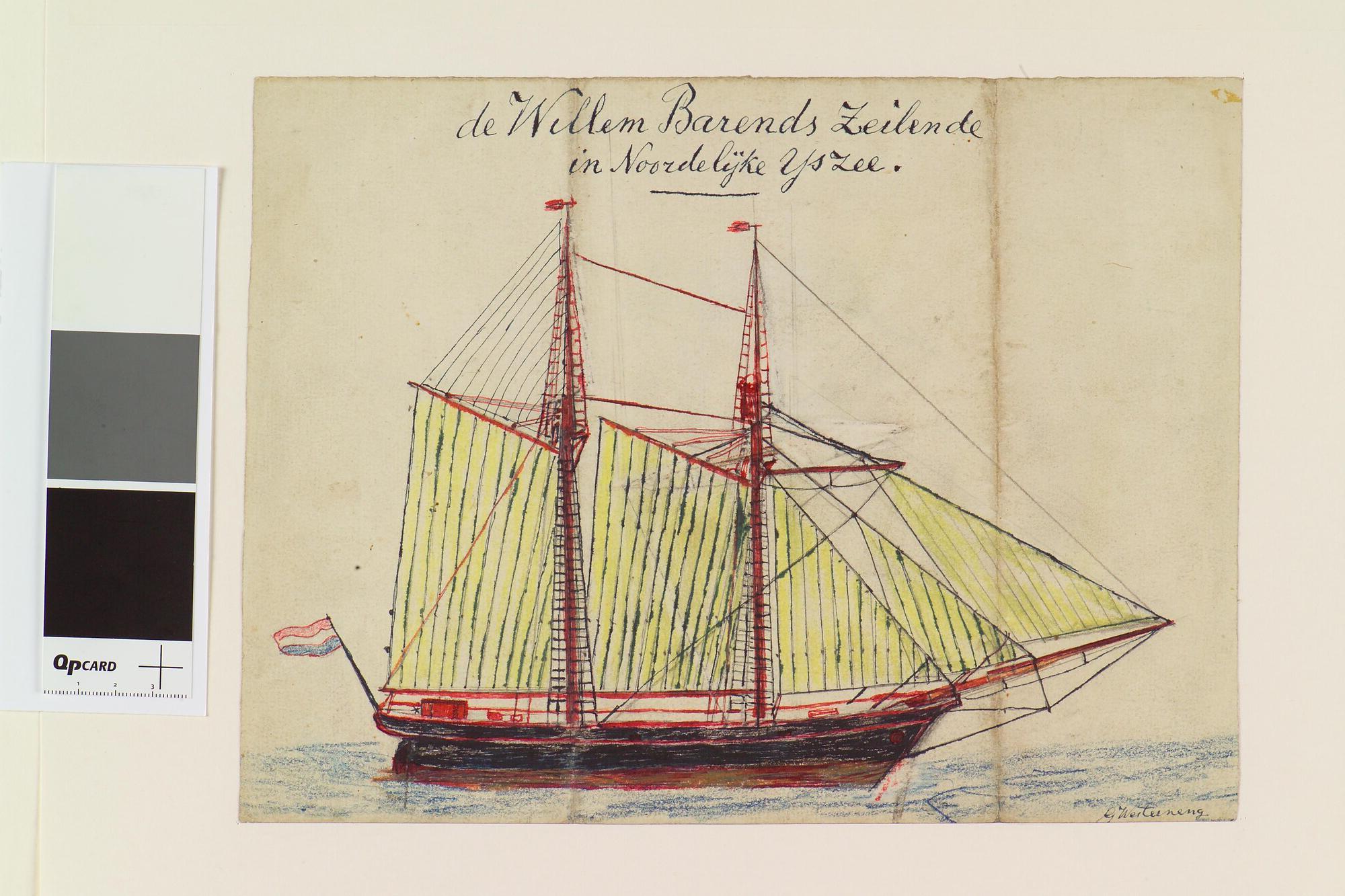 Tekening van de Willem Barents in de Noordelijke IJszee. Met een schetsje van het schip op de andere zijde. Uit een serie tekeningen gemaakt tijdens de tochten met de poolschoener Willem Barents van 1878 tot 1884.