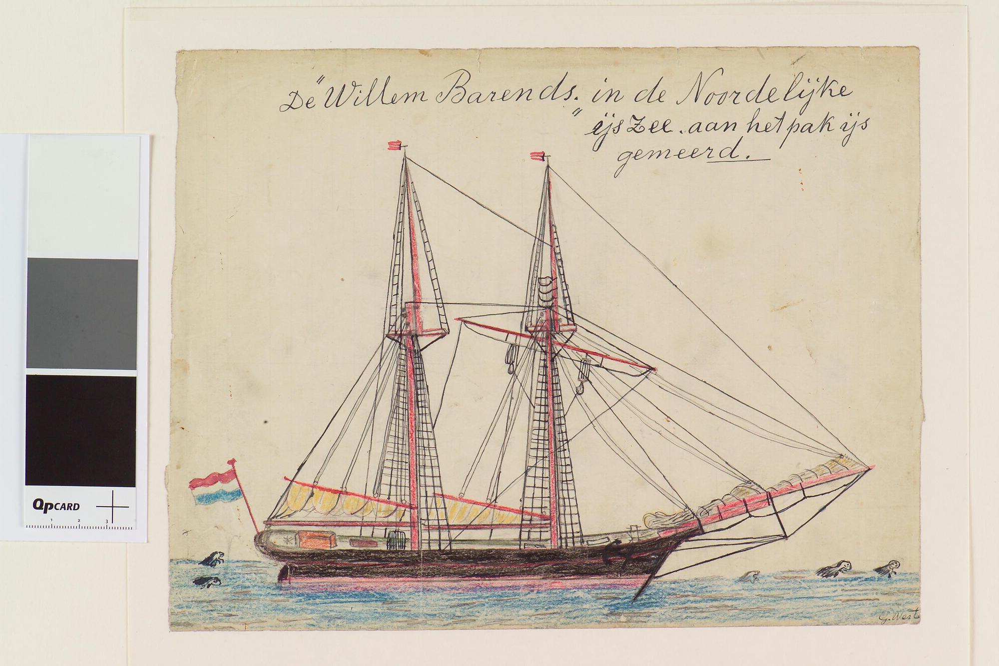 Tekening van de poolschoener Willem Barents in de Noordelijke IJszee aan het pakijs gemeerd. Uit een serie tekeningen gemaakt tijdens de tochten met de poolschoener Willem Barents van 1878 tot 1884.