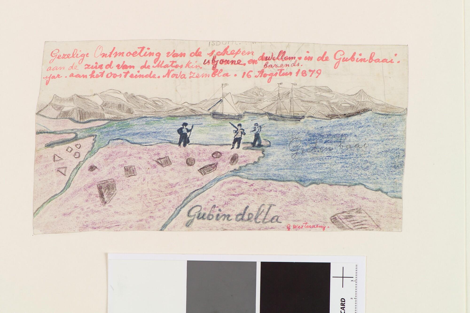 Tekening met daarop afgebeeld een ontmoeting tussen de schepen Isbjorne en Willem Barents die plaatsvond in de Gubinbaai op 16 augustus 1879. Uit een serie tekeningen gemaakt tijdens de tochten met de poolschoener Willem Barents van 1878 tot 1884.