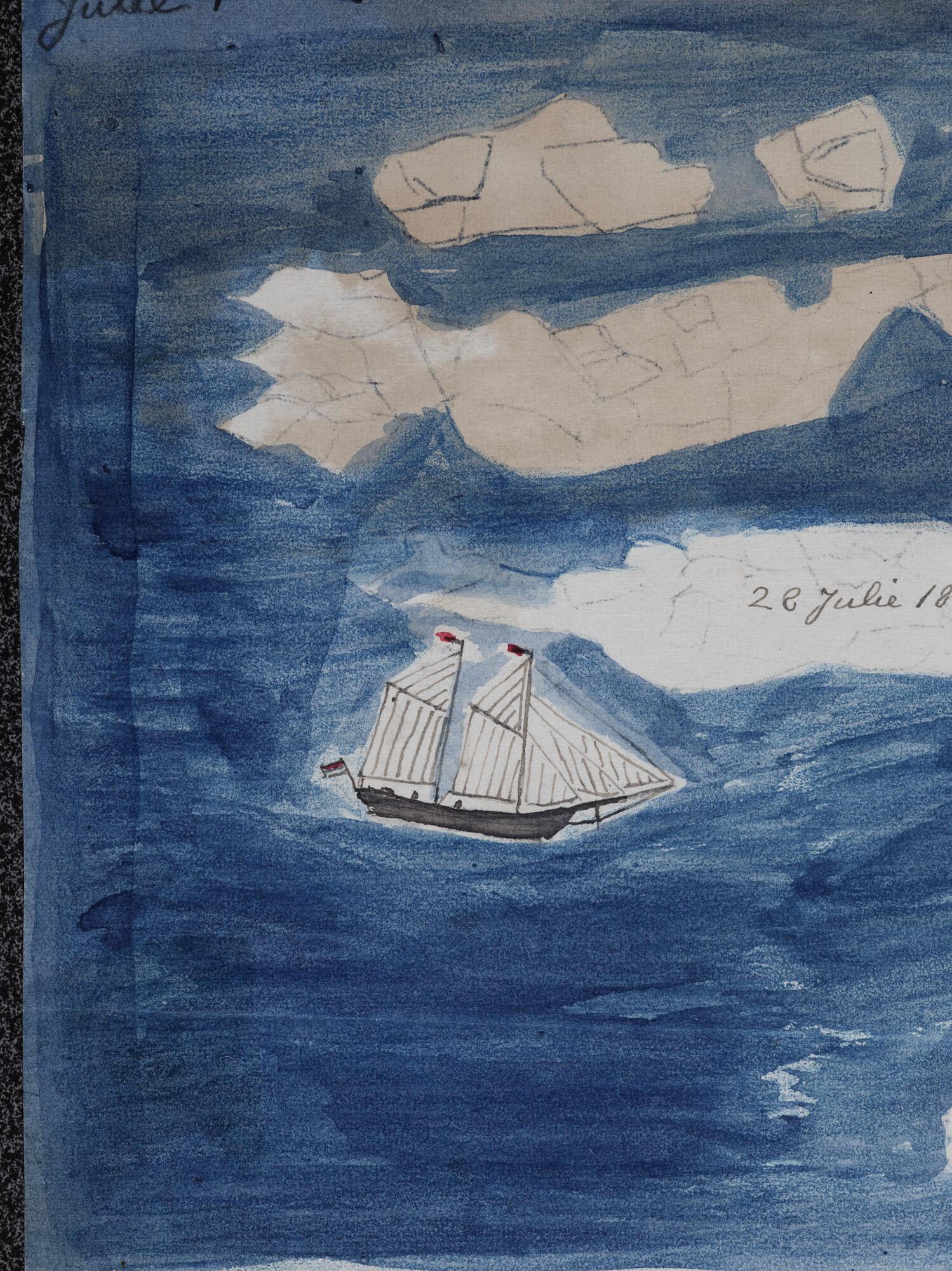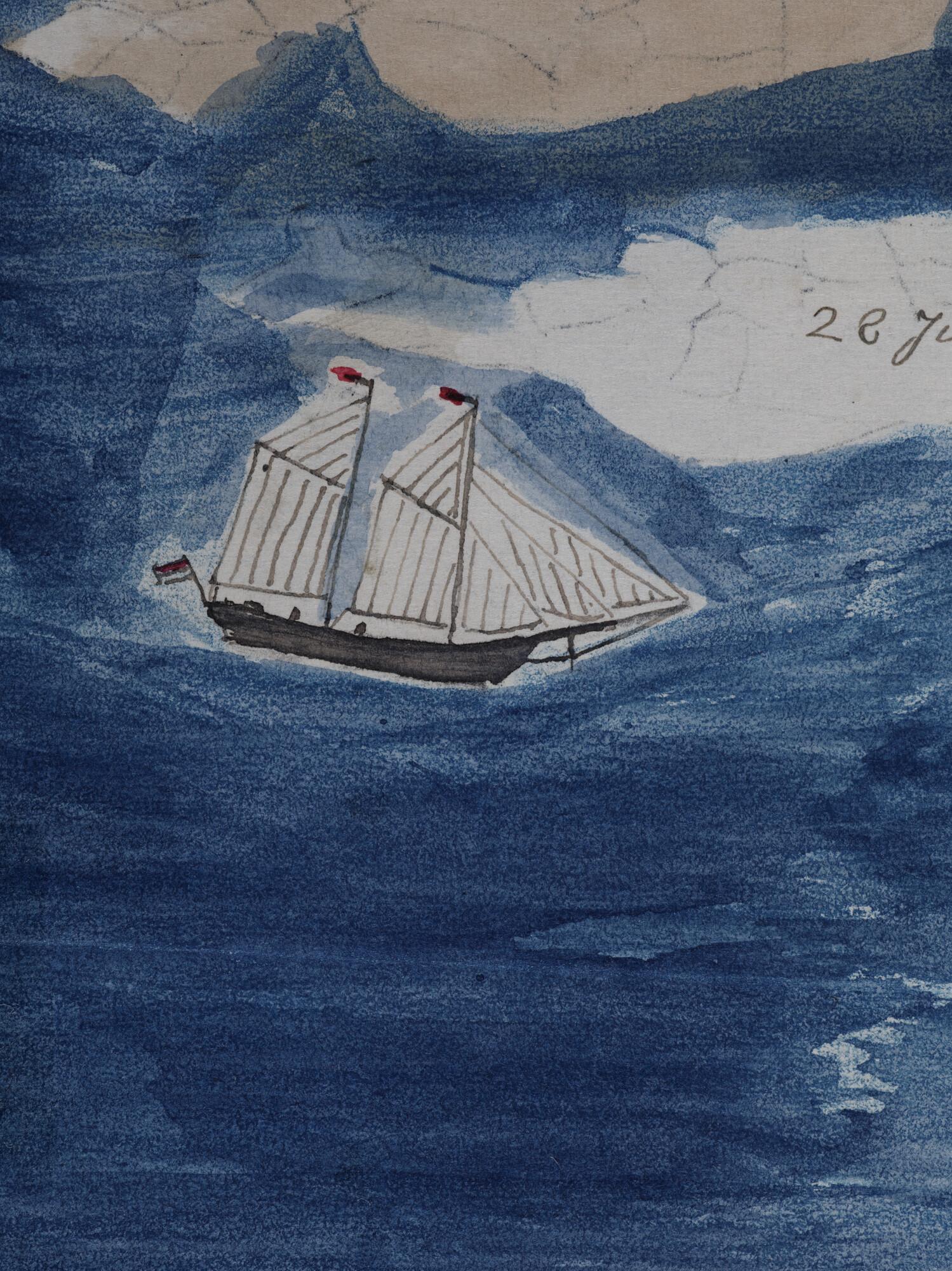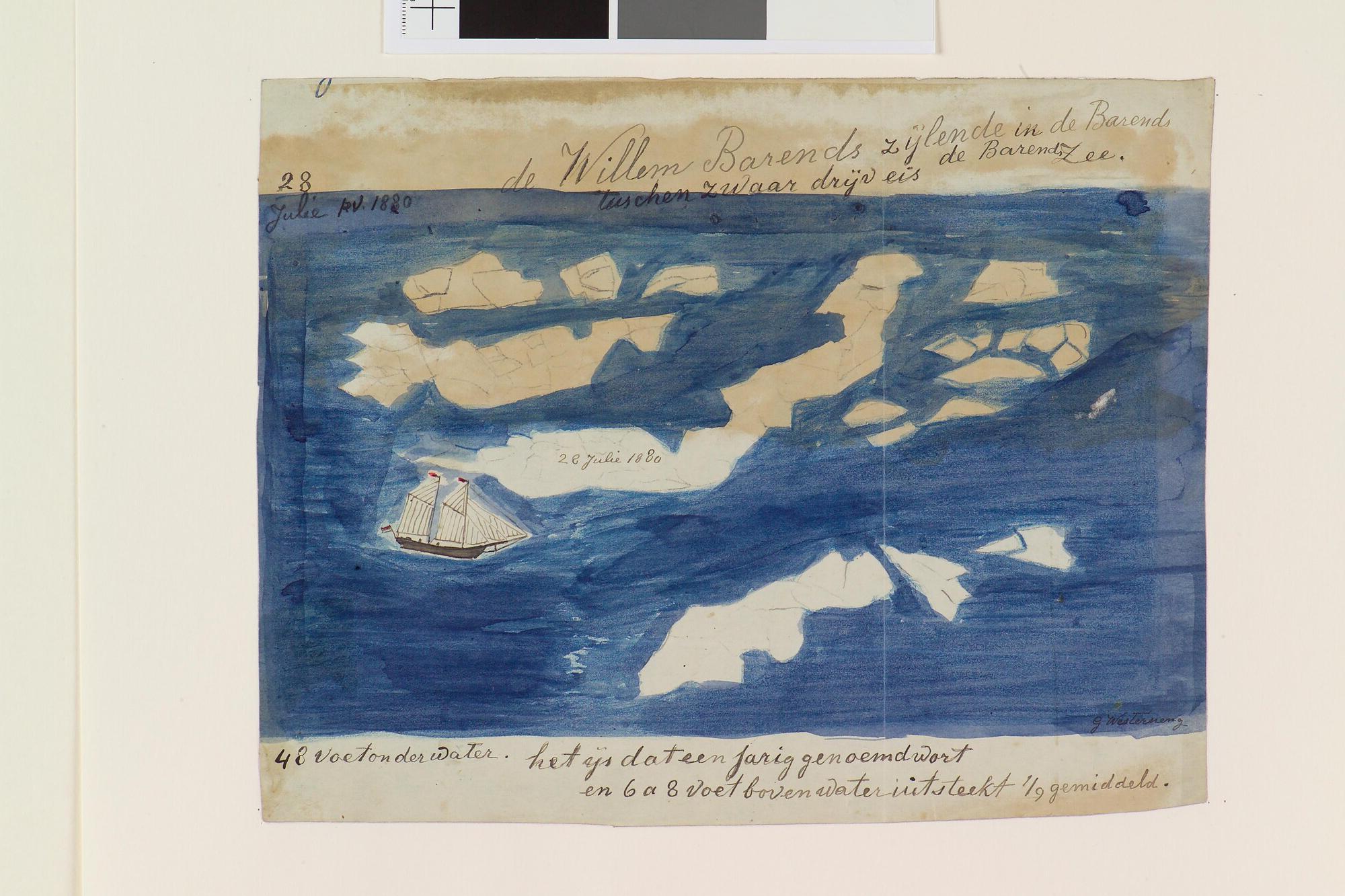 Tekening met daarop de zeilende Willem Barents afgebeeld tussen zwaar drijfijs op de Barentszzee. Uit een serie tekeningen gemaakt tijdens de tochten met de poolschoener Willem Barents van 1878 tot 1884.