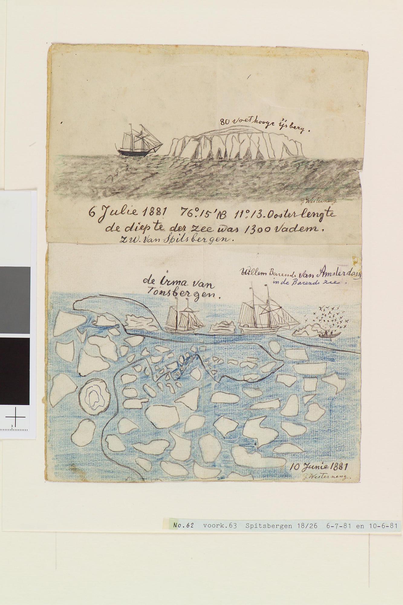 Tekening met aan de ene zijde de Willem Barents nabij Spitsbergen, de Irma en de Willem Barents in de Barentszzee en aan de andere zijde verschillende vissen. Uit een serie tekeningen gemaakt tijdens de tochten met de poolschoener Willem Barents van 1878 tot 1884.
