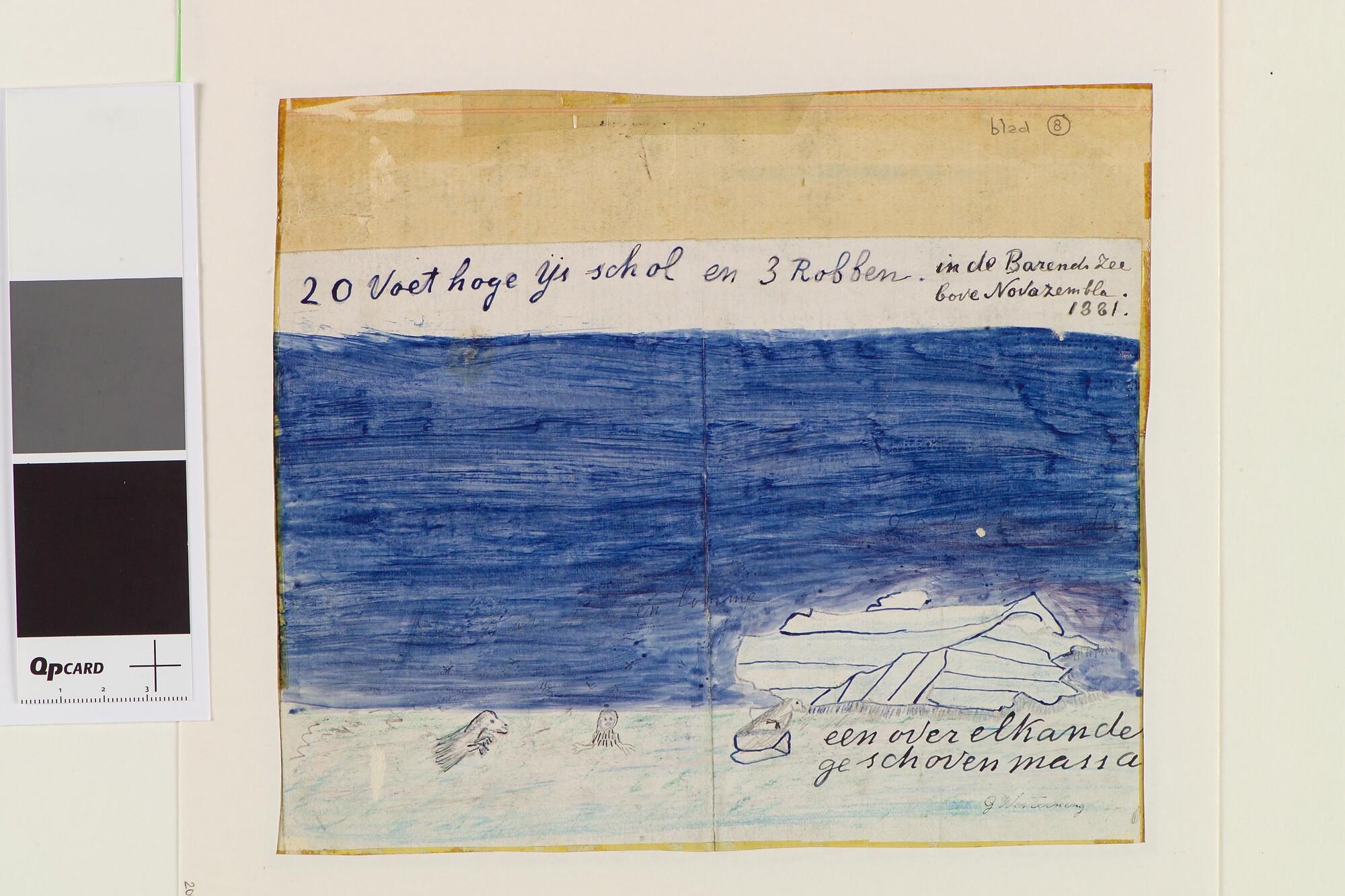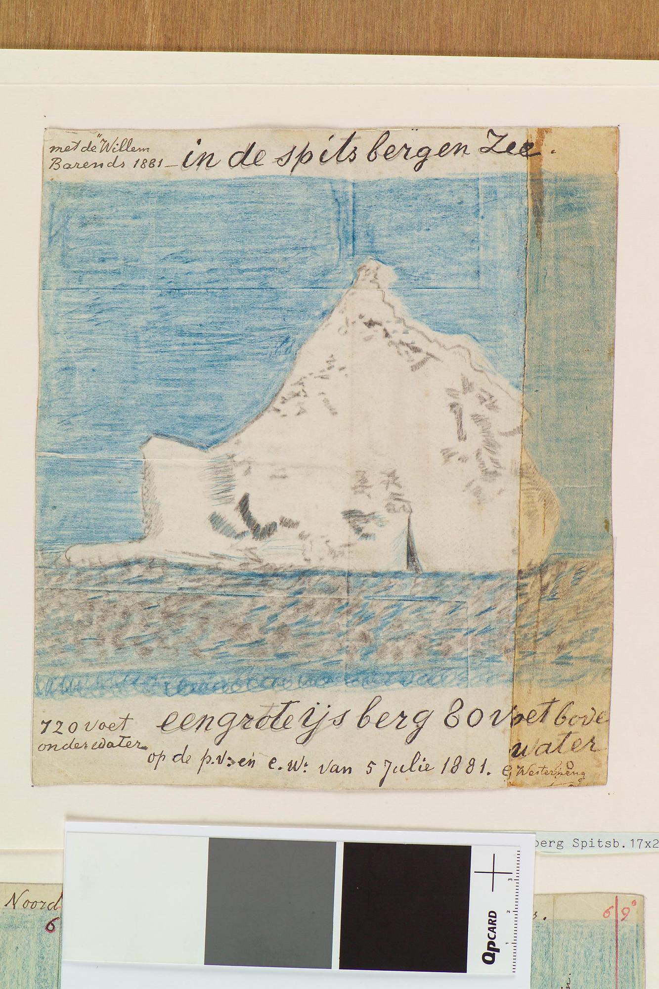 Tekening met aan de beide zijden een afbeelding van een ijsberg in de Noordelijke IJszee. Uit een serie tekeningen gemaakt tijdens de tochten met de poolschoener Willem Barents van 1878 tot 1884.