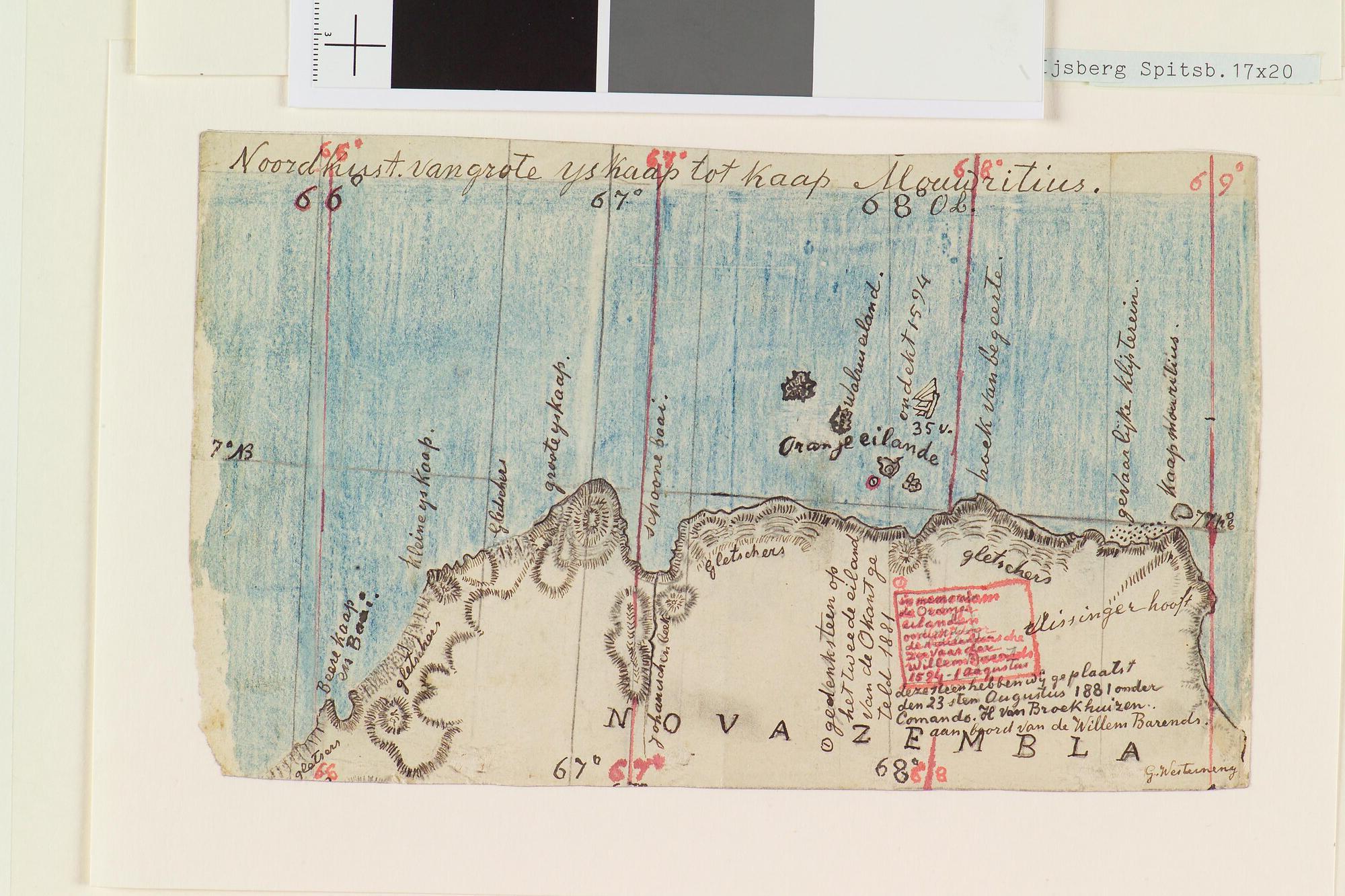 Tekening waarop een kaart is afgebeeld van de noordkant van Nova Zembla en de Noordelijke IJszee met de Oranje eilanden. Uit een serie tekeningen gemaakt tijdens de tochten met de poolschoener Willem Barents van 1878 tot 1884.