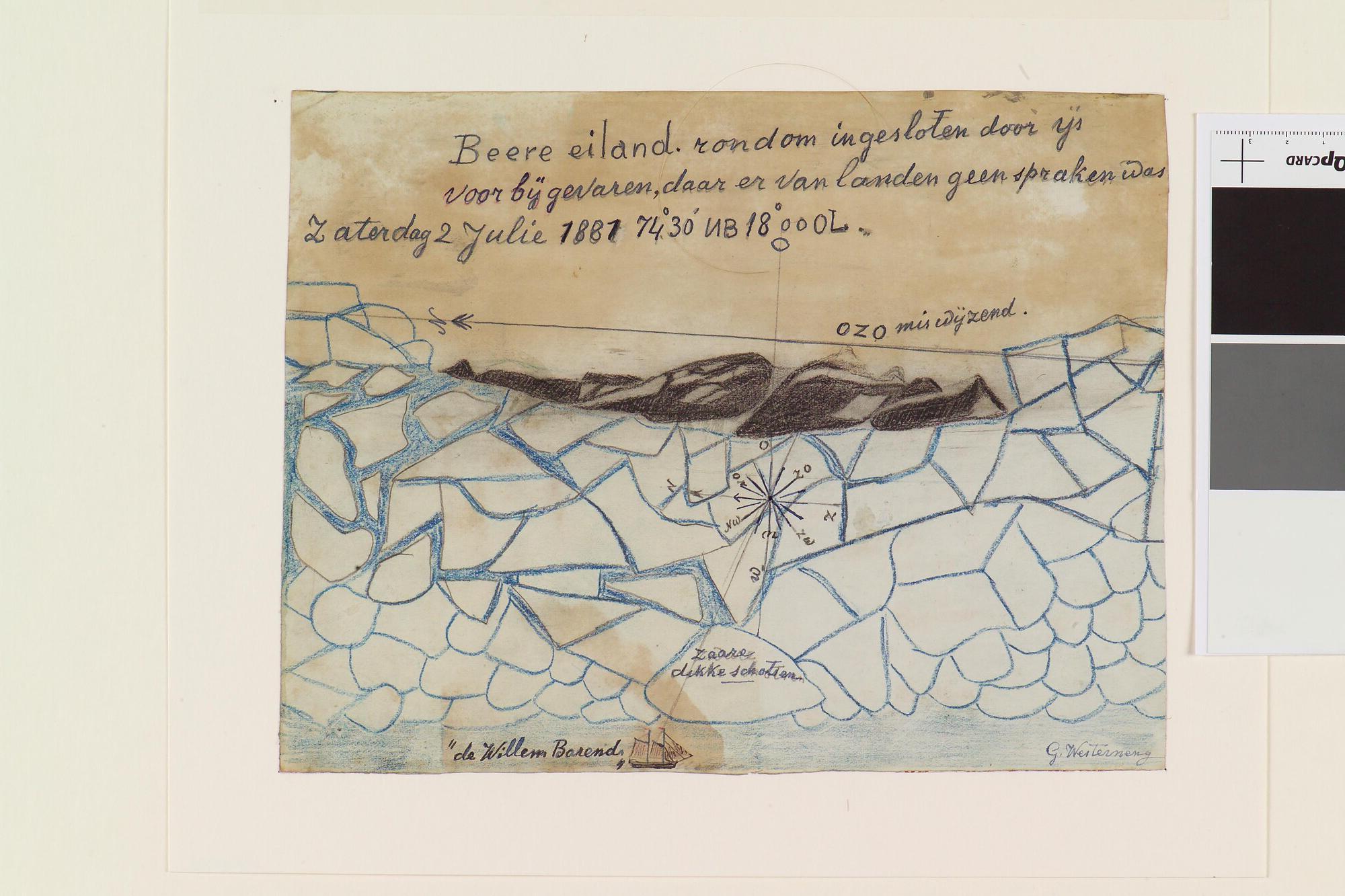 Tekening met daarop afgebeeld het 'Beere eiland', ingesloten door ijs. Uit een serie tekeningen gemaakt tijdens de tochten met de poolschoener Willem Barents van 1878 tot 1884.