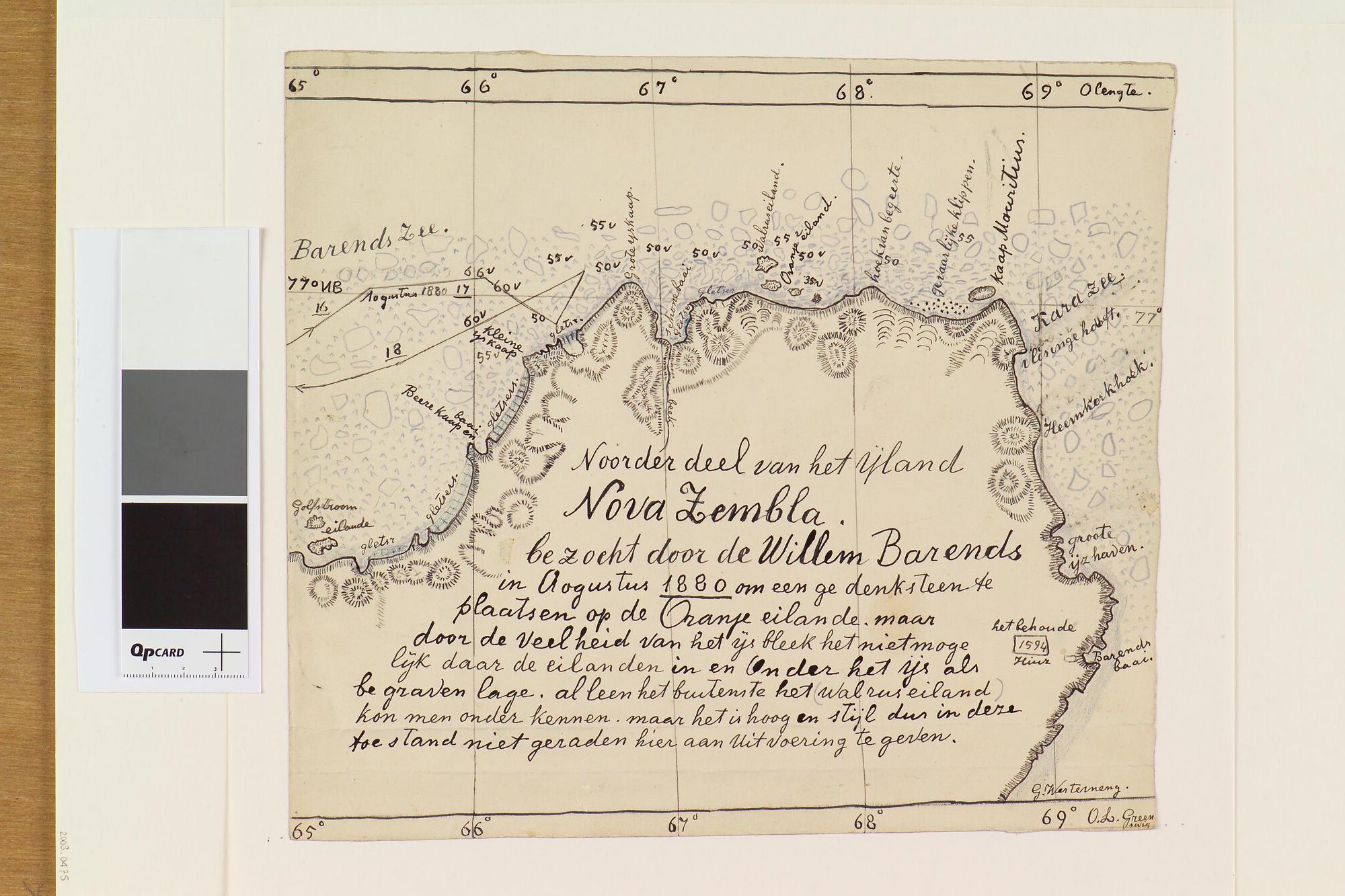 Tekening waarop een kaart is afgebeeld van het noordelijke deel van het eiland Nova Zembla, bezocht in augustus 1880. Uit een serie tekeningen gemaakt tijdens de tochten met de poolschoener Willem Barents van 1878 tot 1884.