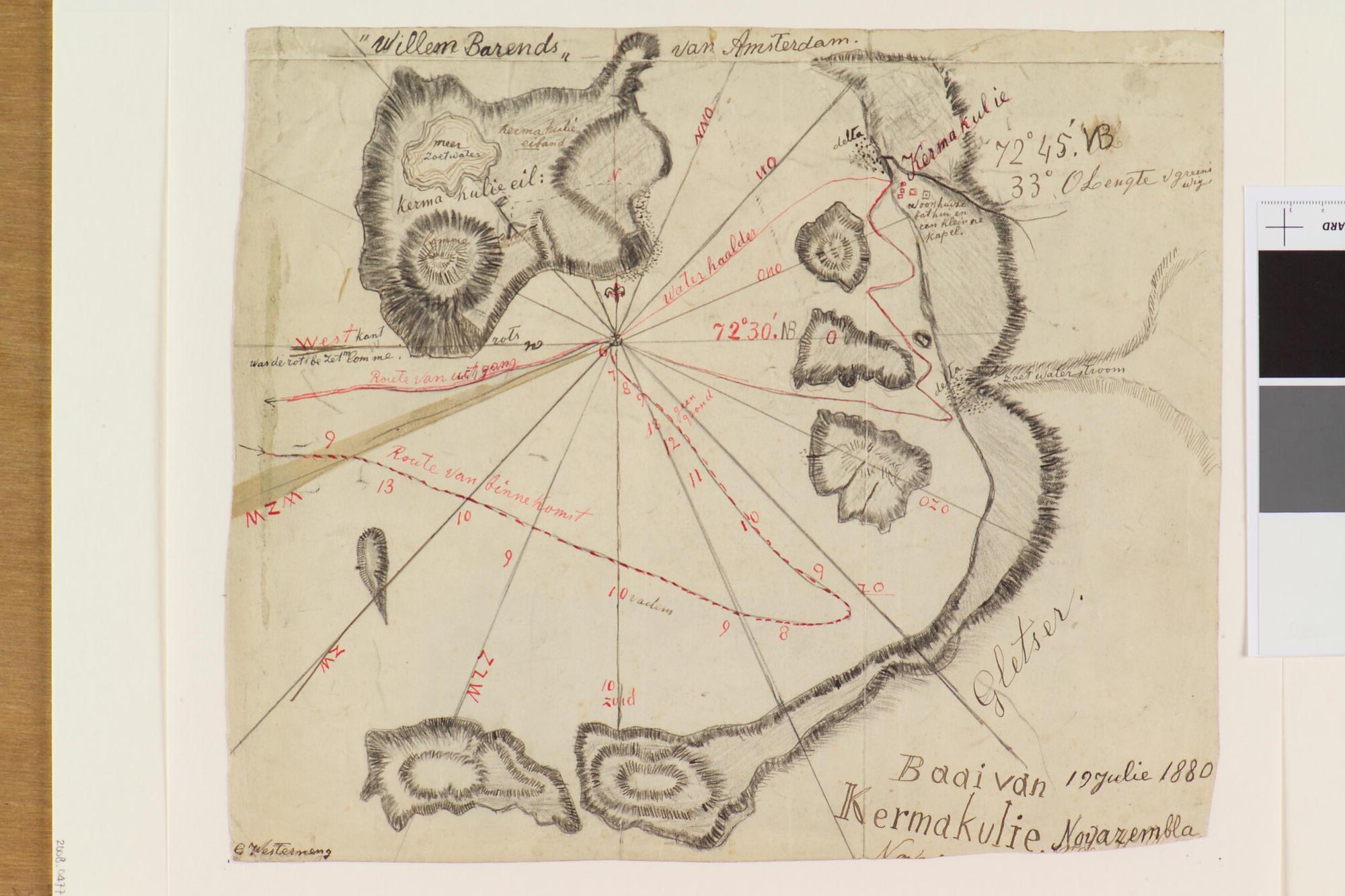 Tekening waarop een kaart is afgebeeld van de 'baai van Kermakulie'. Uit een serie tekeningen gemaakt tijdens de tochten met de poolschoener Willem Barents van 1878 tot 1884.