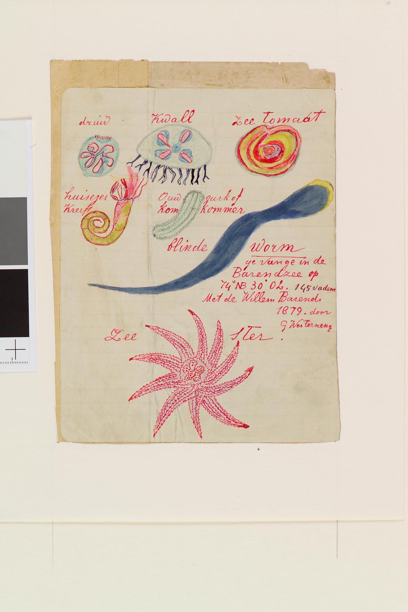 Tekening van verschillende zeedieren, waaronder een zeetomaat, een zeekomkommer, een kwal en een zeester, gevangen met de kor in de Noordelijke IJszee. Op de achterkant drie keer een zeehond (waarschijnlijk). Uit een serie tekeningen gemaakt tijdens de tochten met de poolschoener Willem Barents van 1878 tot 1884.