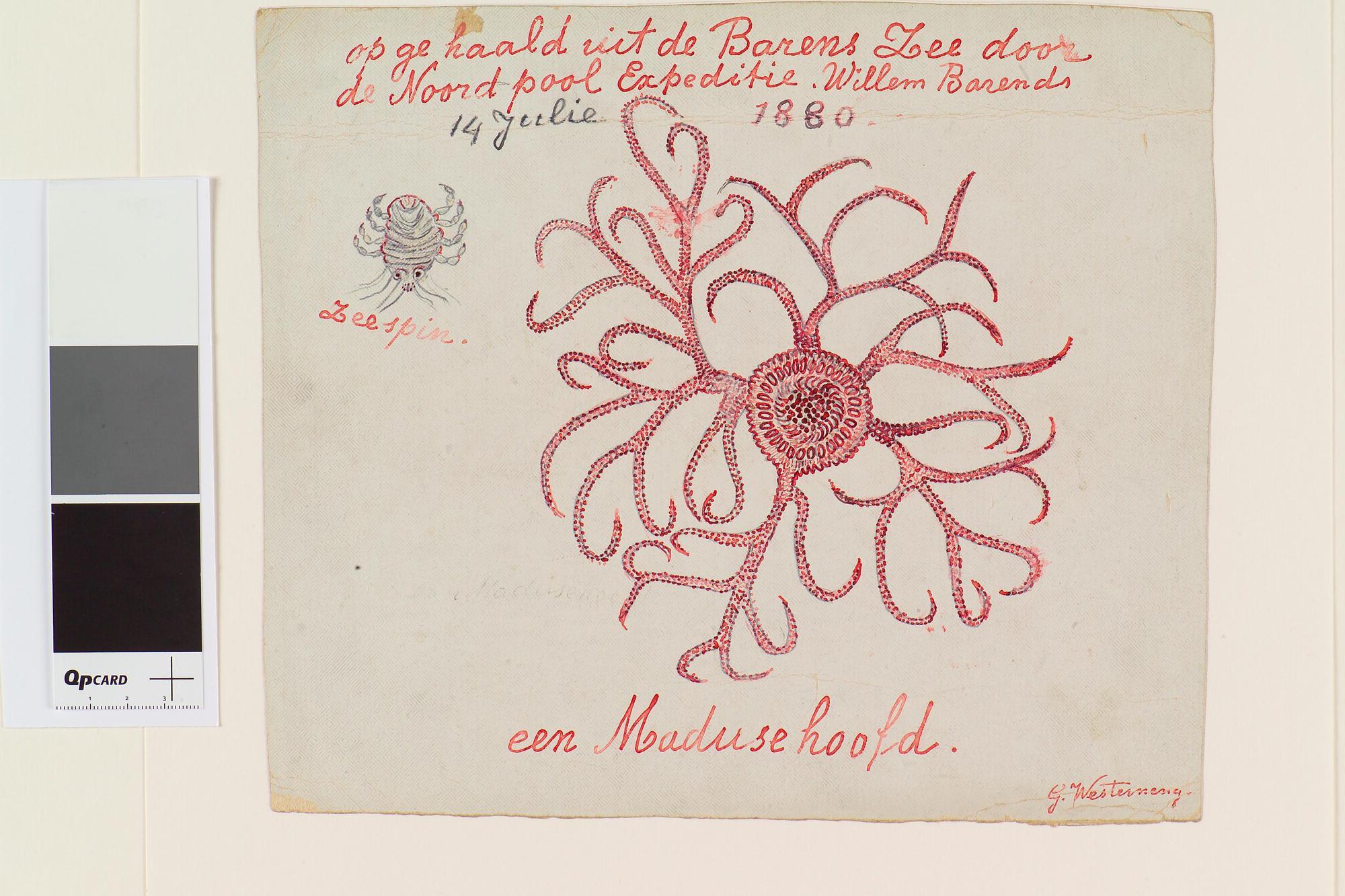 Tekening waarop twee zeedieren zijn afgebeeld, gevangen in de Barentszzee op 14 juli 1880. Uit een serie tekeningen gemaakt tijdens de tochten met de poolschoener Willem Barents van 1878 tot 1884.