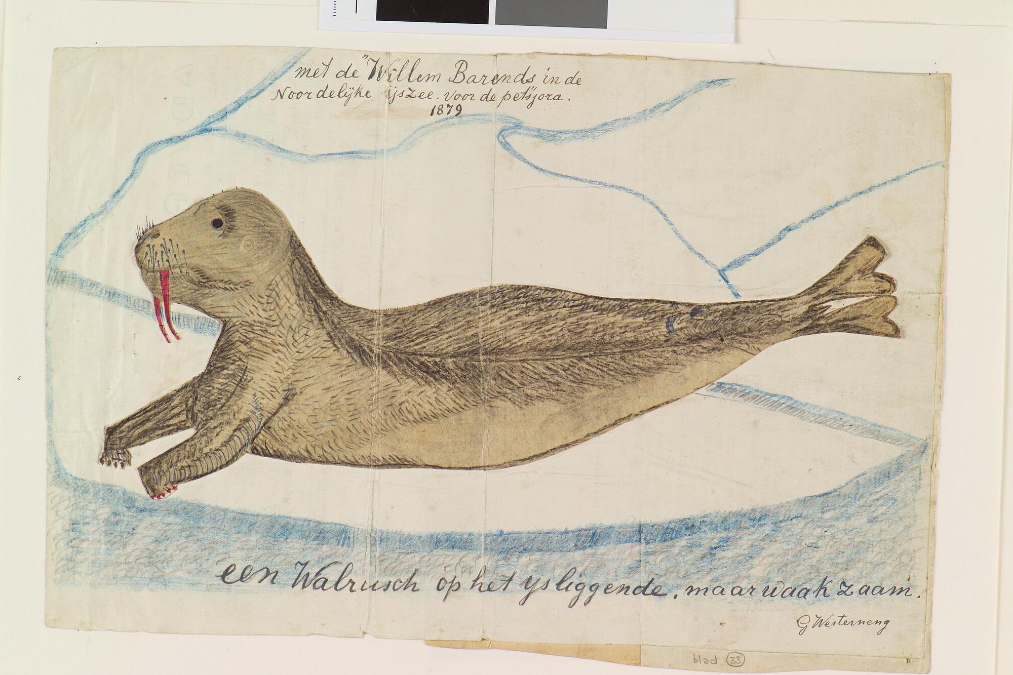Tekening waar op de voorkant een walrus op het ijs is afgebeeld en op de andere zijde een drietal vissen. Uit een serie tekeningen gemaakt tijdens de tochten met de poolschoener Willem Barents van 1878 tot 1884.