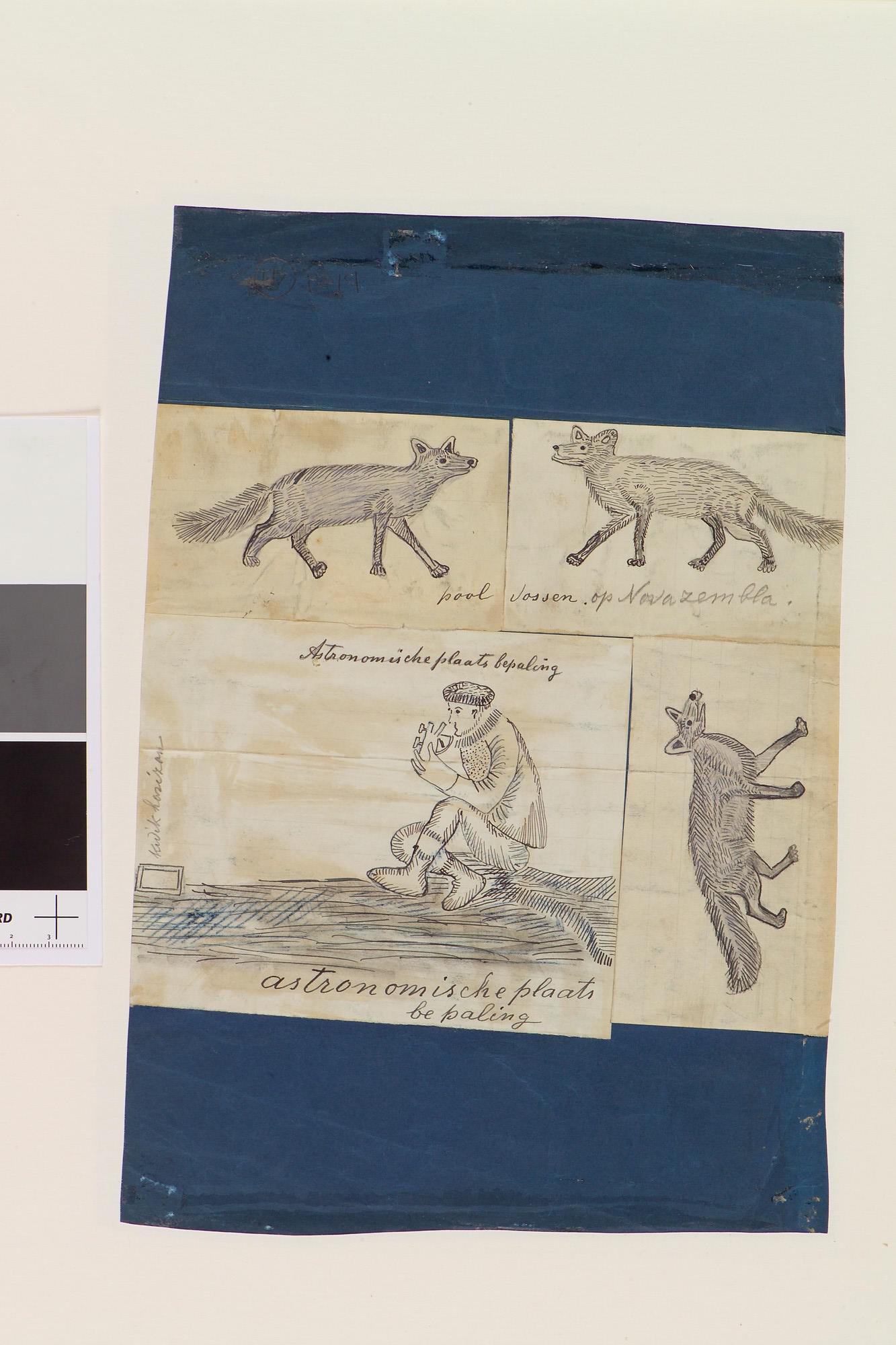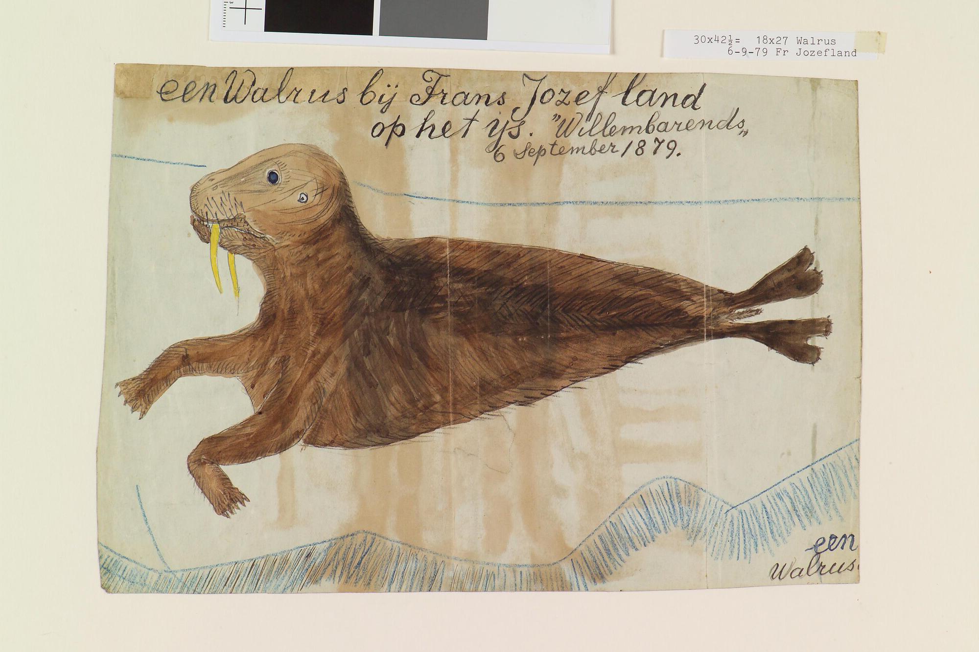 Tekening waar op de voorkant een walrus op het ijs is afgebeeld en op de andere zijde een drietal poolvossen en een man. Uit een serie tekeningen gemaakt tijdens de tochten met de poolschoener Willem Barents van 1878 tot 1884.