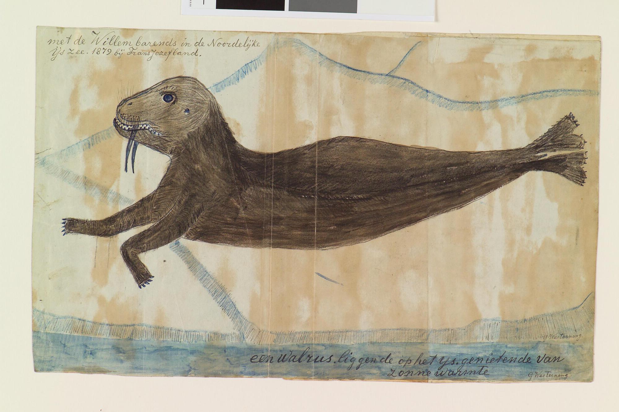Tekening waarop een walrus op het ijs is afgebeeld, gezien in 1879 in de Noordelijke IJszee. Uit een serie tekeningen gemaakt tijdens de tochten met de poolschoener Willem Barents van 1878 tot 1884.