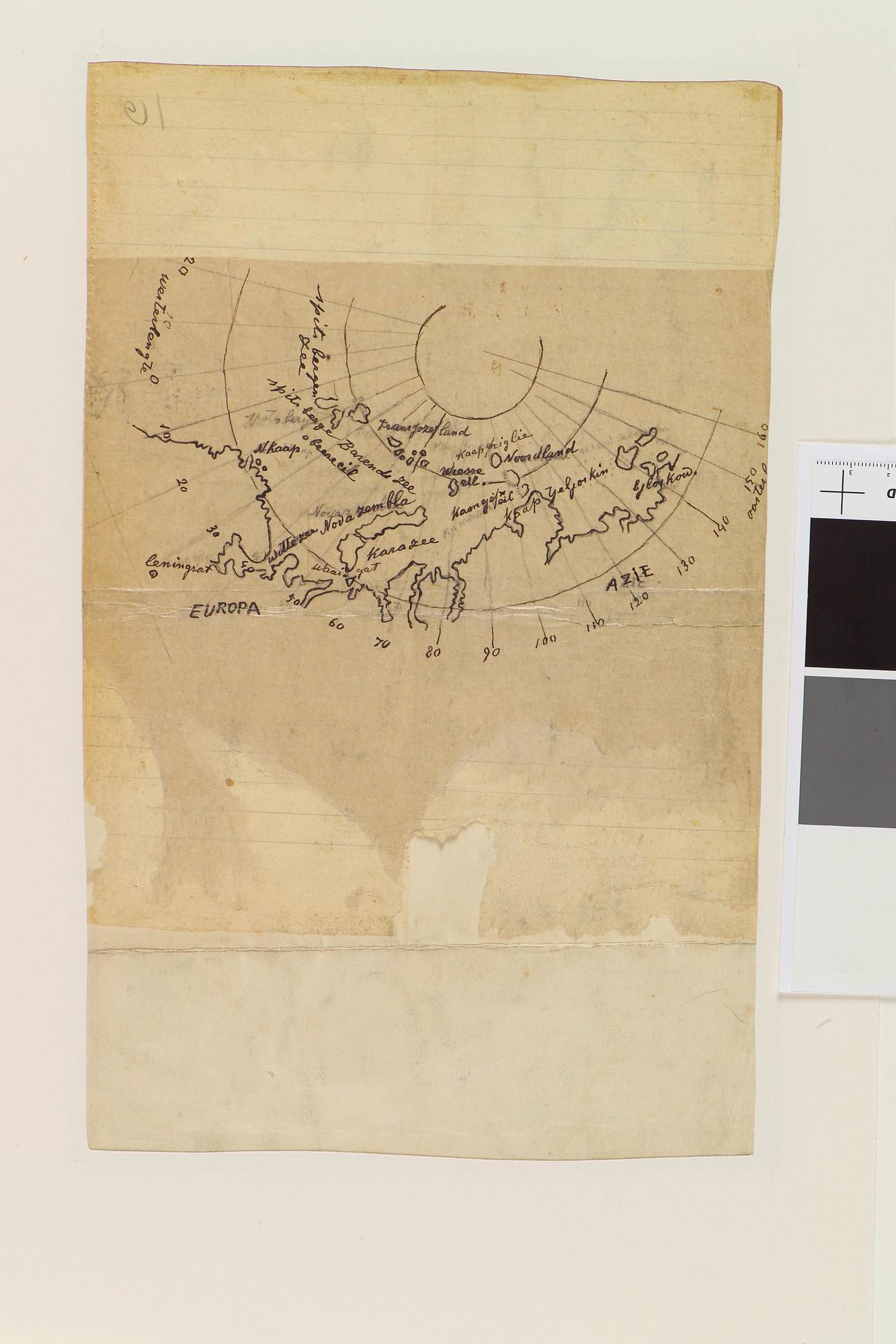 Tekening van een opspringende zeehond, en op de andere zijde een deel van een kaart