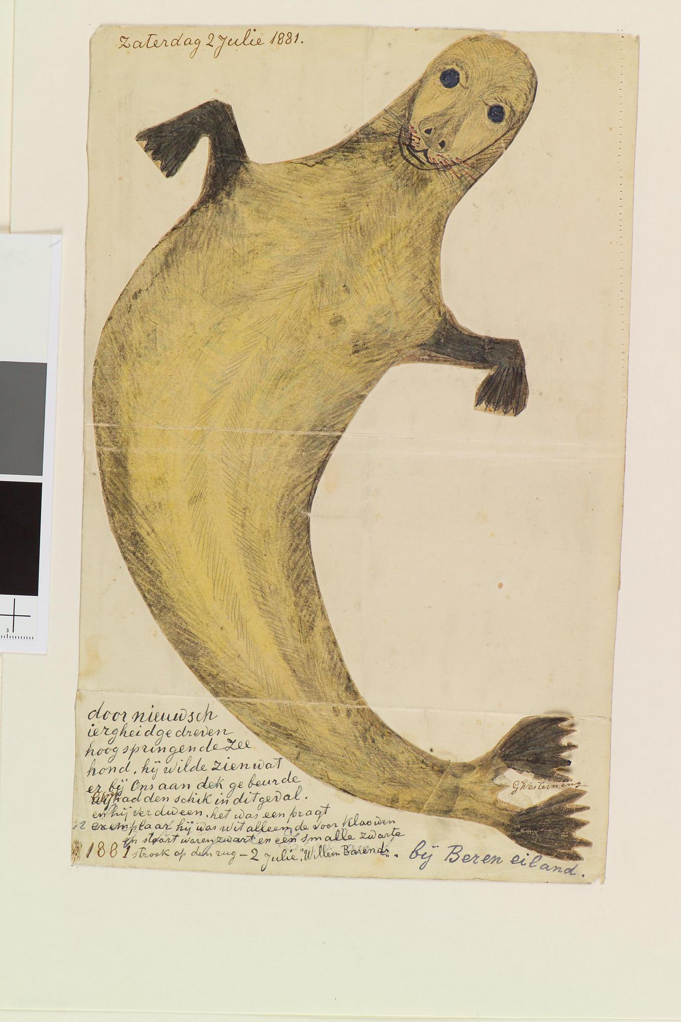 Tekening van een opspringende zeehond, frontaal gezien. Uit een serie tekeningen gemaakt tijdens de tochten met de poolschoener Willem Barents van 1878 tot 1884.