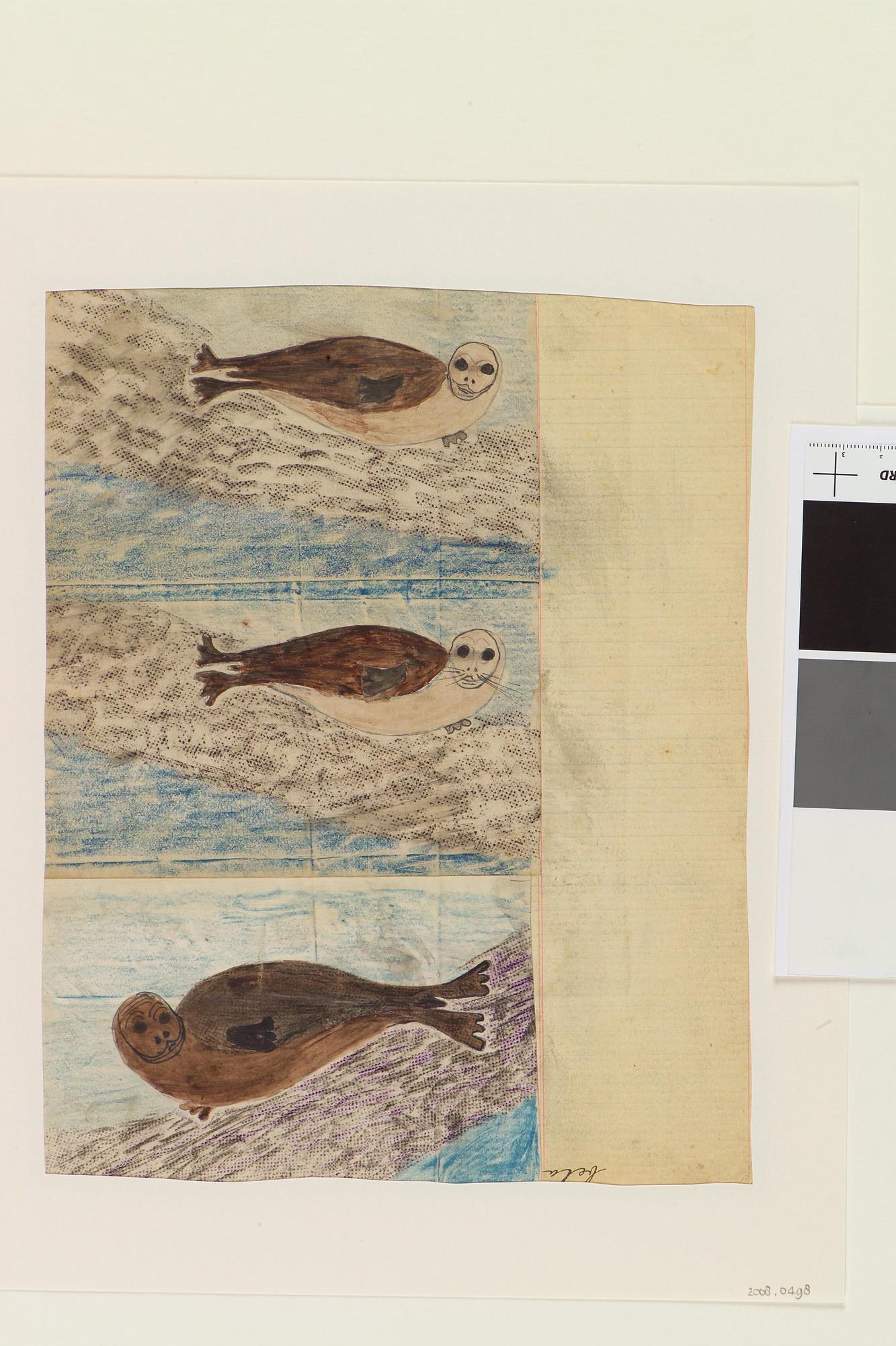Tekening van een ijsbeer, walrussen en een zeehond, en op de andere zijde drie zeehonden