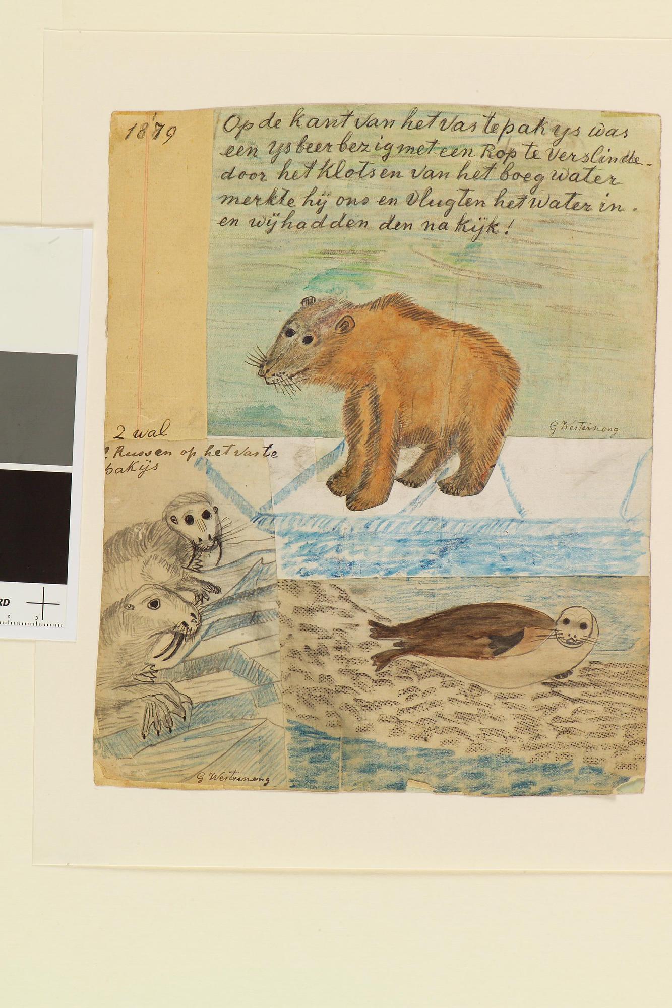 Tekening met een soort collage van verschillende tekeningen van een ijsbeer, walrussen en zeehonden op de voor- en andere zijde. Uit een serie tekeningen gemaakt tijdens de tochten met de poolschoener Willem Barents van 1878 tot 1884.