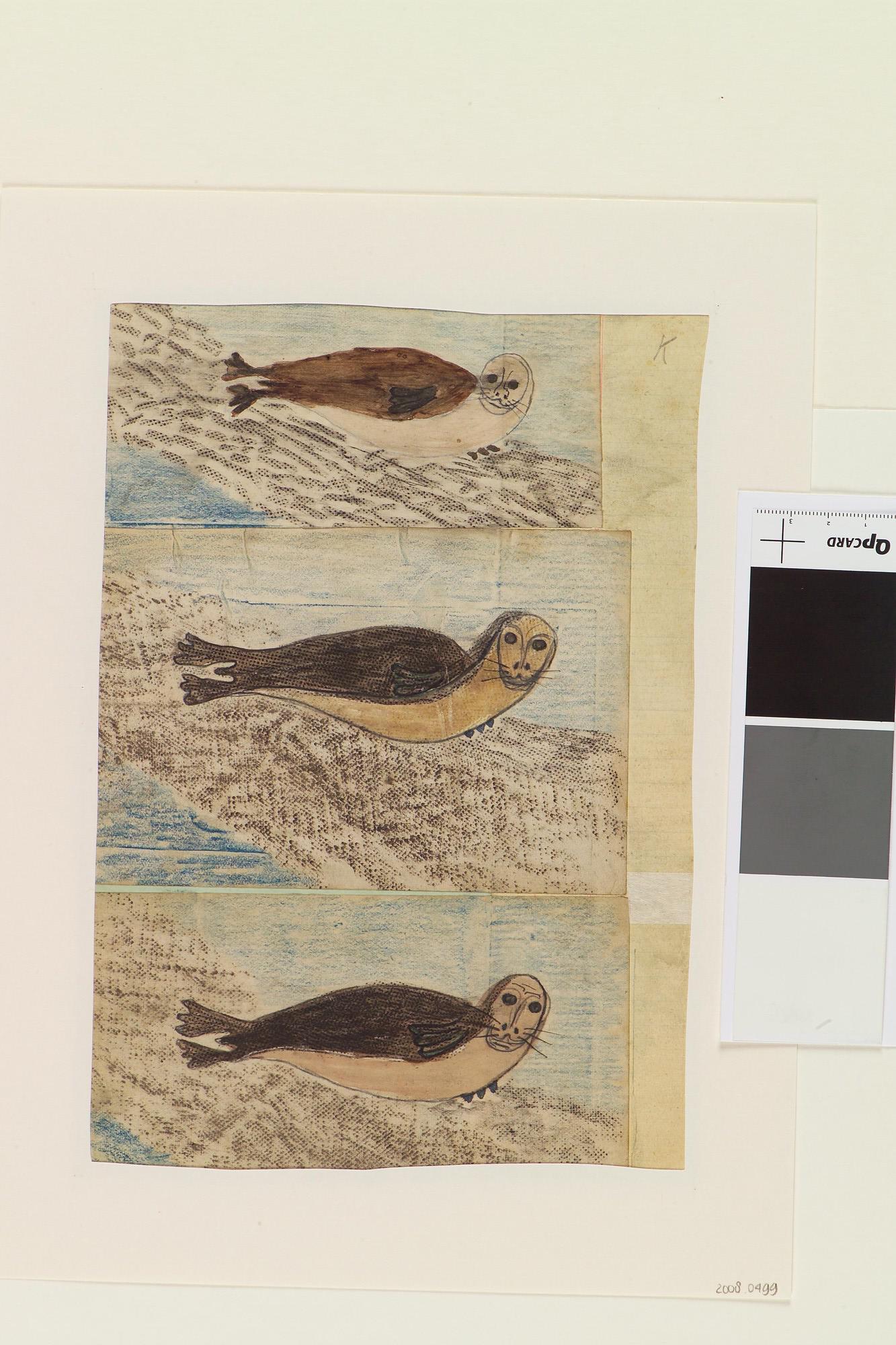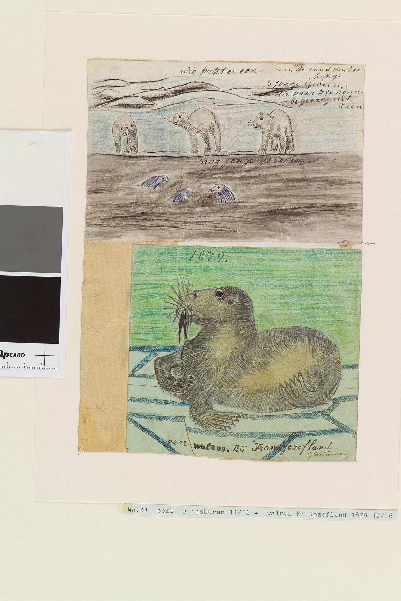 Tekening met een soort collage van verschillende tekeningen. Op de ene zijde van het papier ijsberen en een walrus, op de andere zijde drie zeehonden. Uit een serie tekeningen gemaakt tijdens de tochten met de poolschoener Willem Barents van 1878 tot 1884.