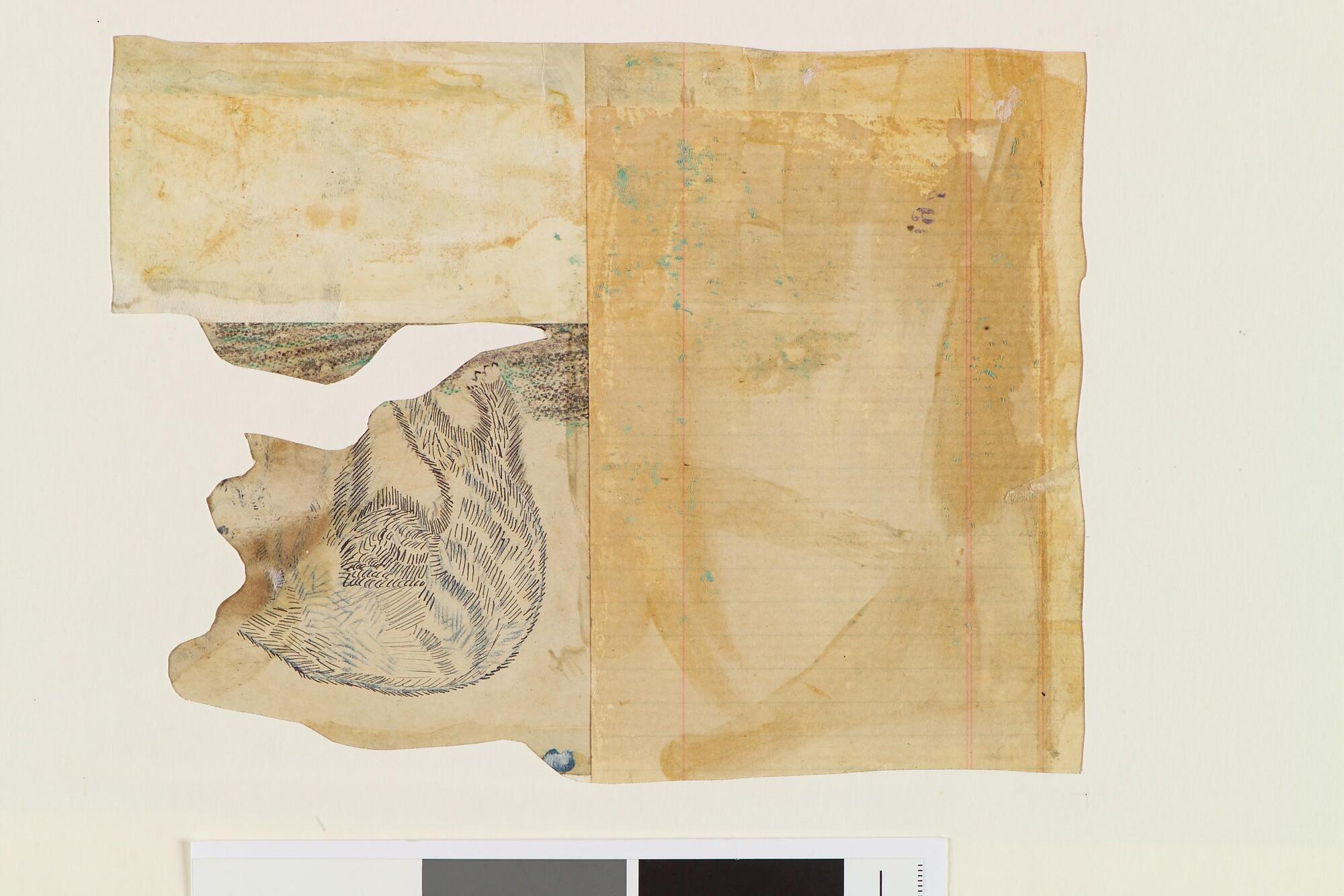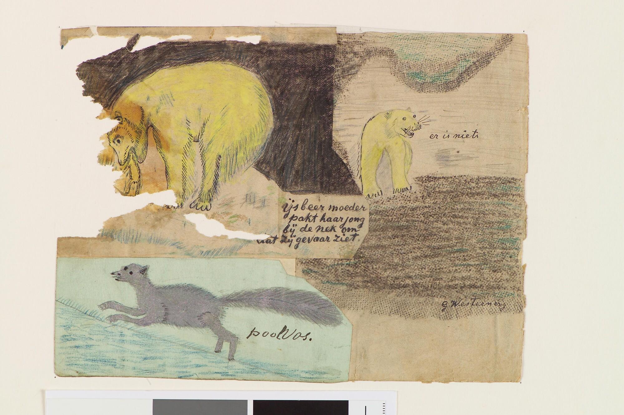 Tekening met een soort collage van verschillende tekeningen. Er is een tafereel afgebeeld met een ijsbeer, een ijsbeermoeder met haar jong en een poolvos. Uit een serie tekeningen gemaakt tijdens de tochten met de poolschoener Willem Barents van 1878 tot 1884.
