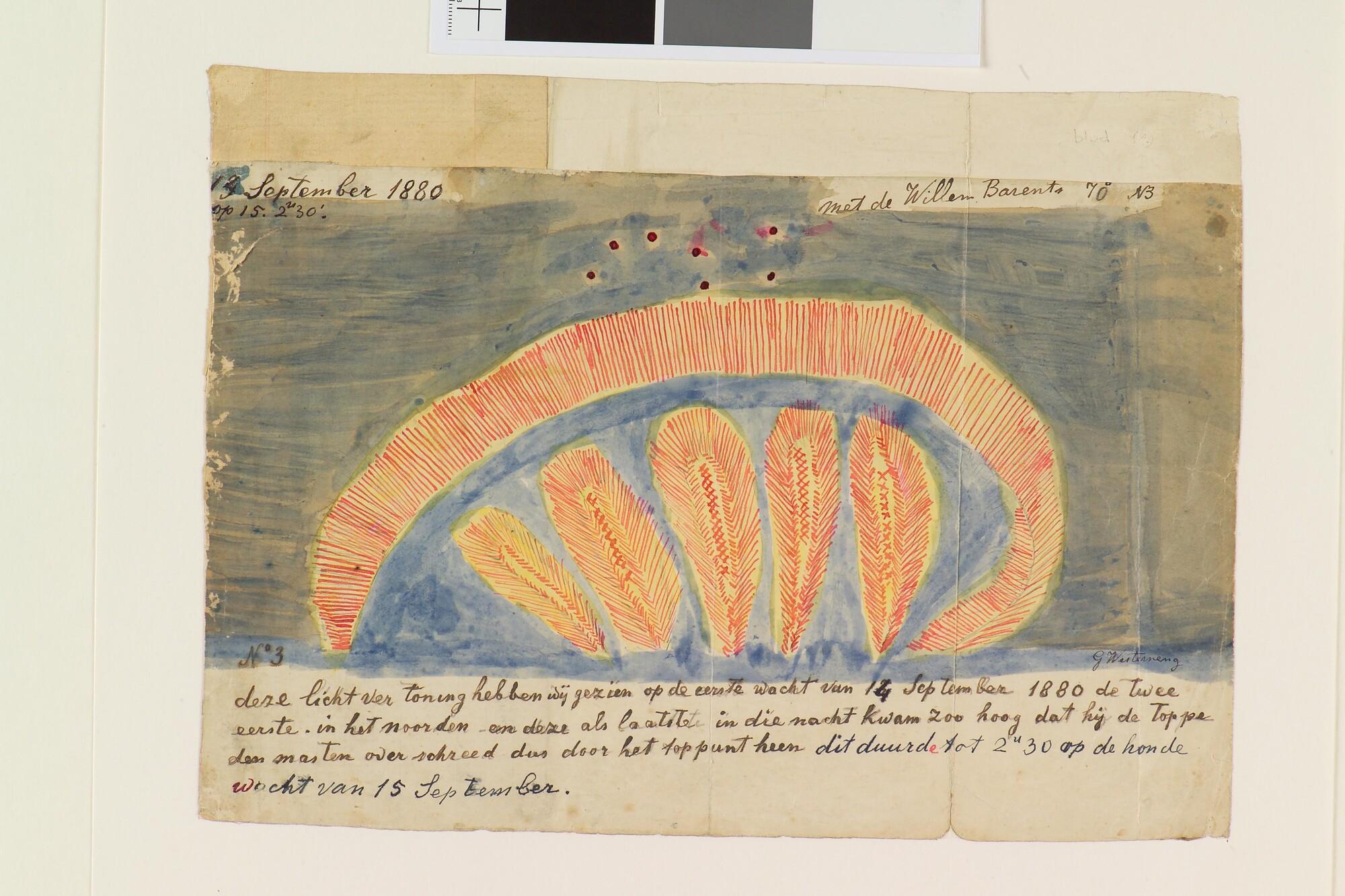Tekening van een weergave van het noorderlicht door middel van een boog met daaronder vijf staande veervormen. Middenboven het sterrenbeeld Grote Beer. Uit een serie tekeningen gemaakt tijdens de tochten met de poolschoener Willem Barents van 1878 tot 1884.