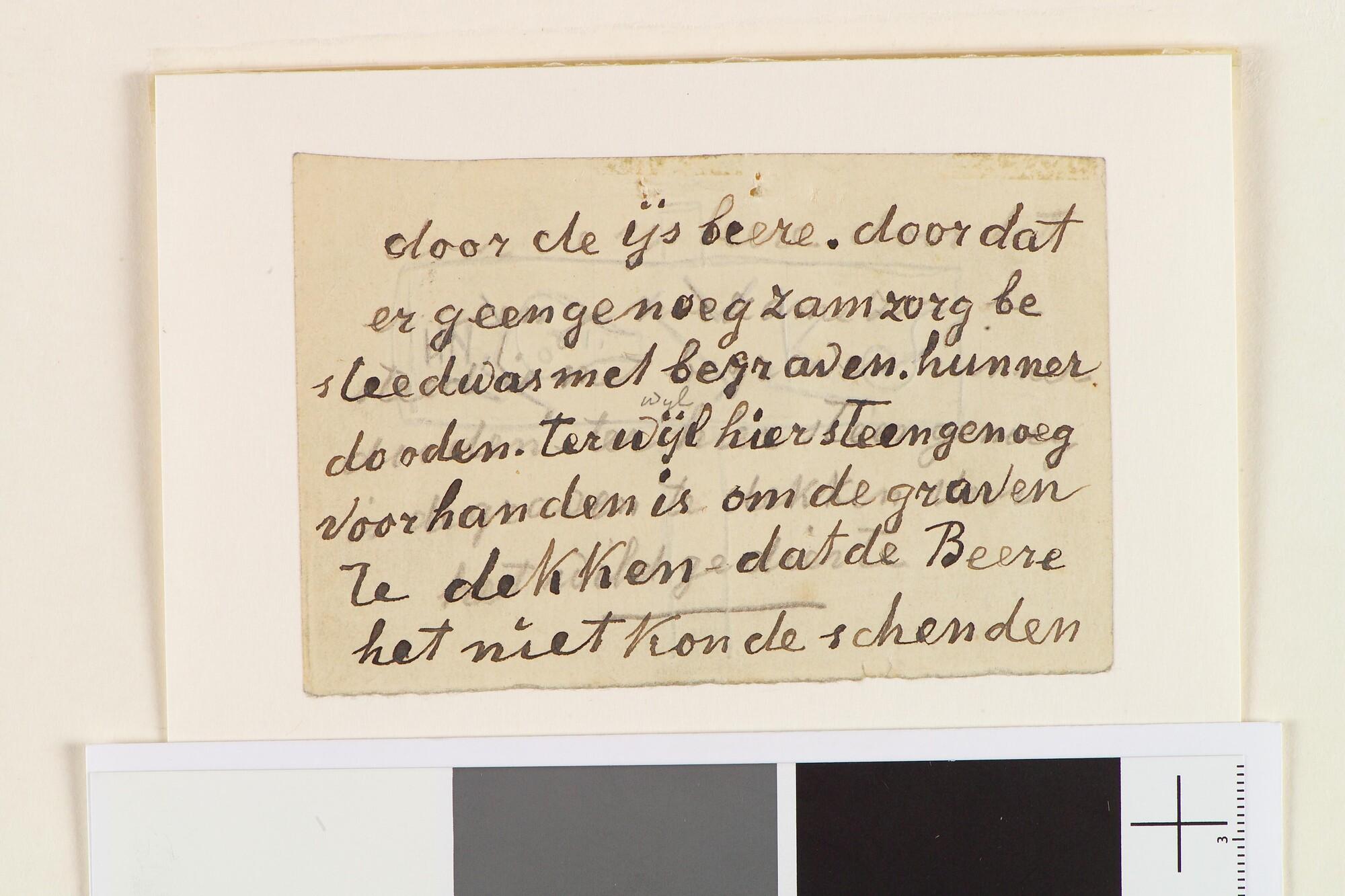 Tekening van een grafkruis, en op de andere zijde een deel van een dagboek